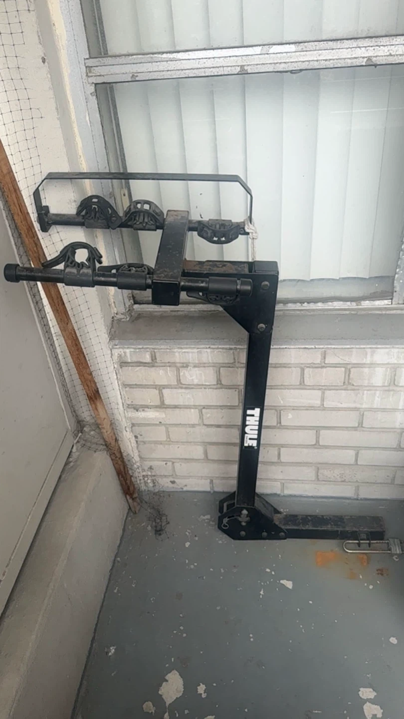 Thule 3-bike rack in good condition overall. Holds 3 bikes. Has all straps and cradles. Missing keys, but replacement locks can be easily purchased and installed. Shows some rust from long-term storage. Priced accordingly for a quick sale. This rack is great for transporting bicycles on your vehicle.