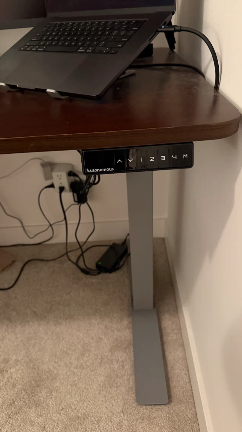 Autonomous standing desk with a dark wood/bamboo table top and grey metal legs. It features an adjustable height control panel with memory presets. This desk is great for a home office setup, allowing you to switch between sitting and standing positions easily.