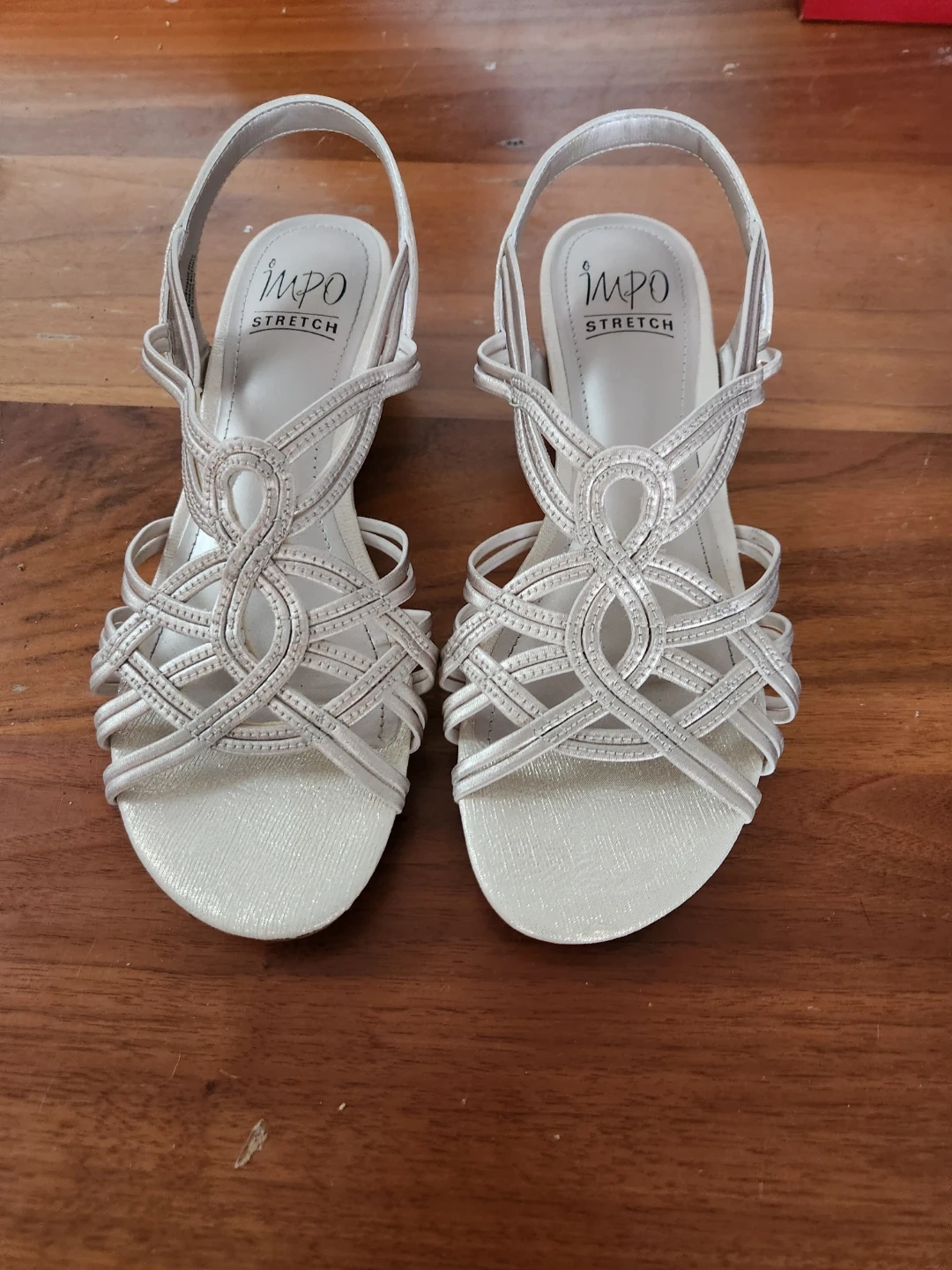 These Impo sandals feature a stylish crisscross design. They have a comfortable stretch fit. The neutral metallic colour makes them versatile for many outfits! Comes with a box, worn once.