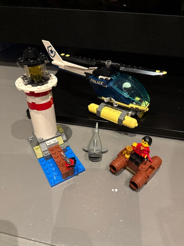 I'm selling a used Lego City Coast Guard set, number 60274, featuring a cool police helicopter with spinning rotors, a lighthouse, a shark figure, and a raft for the crook! It's a great set for imaginative play and building adventures. Specifications: - Set Number: 60274 - Theme: City - Coast Guard - Includes: Police helicopter, lighthouse, shark, raft, and minifigures