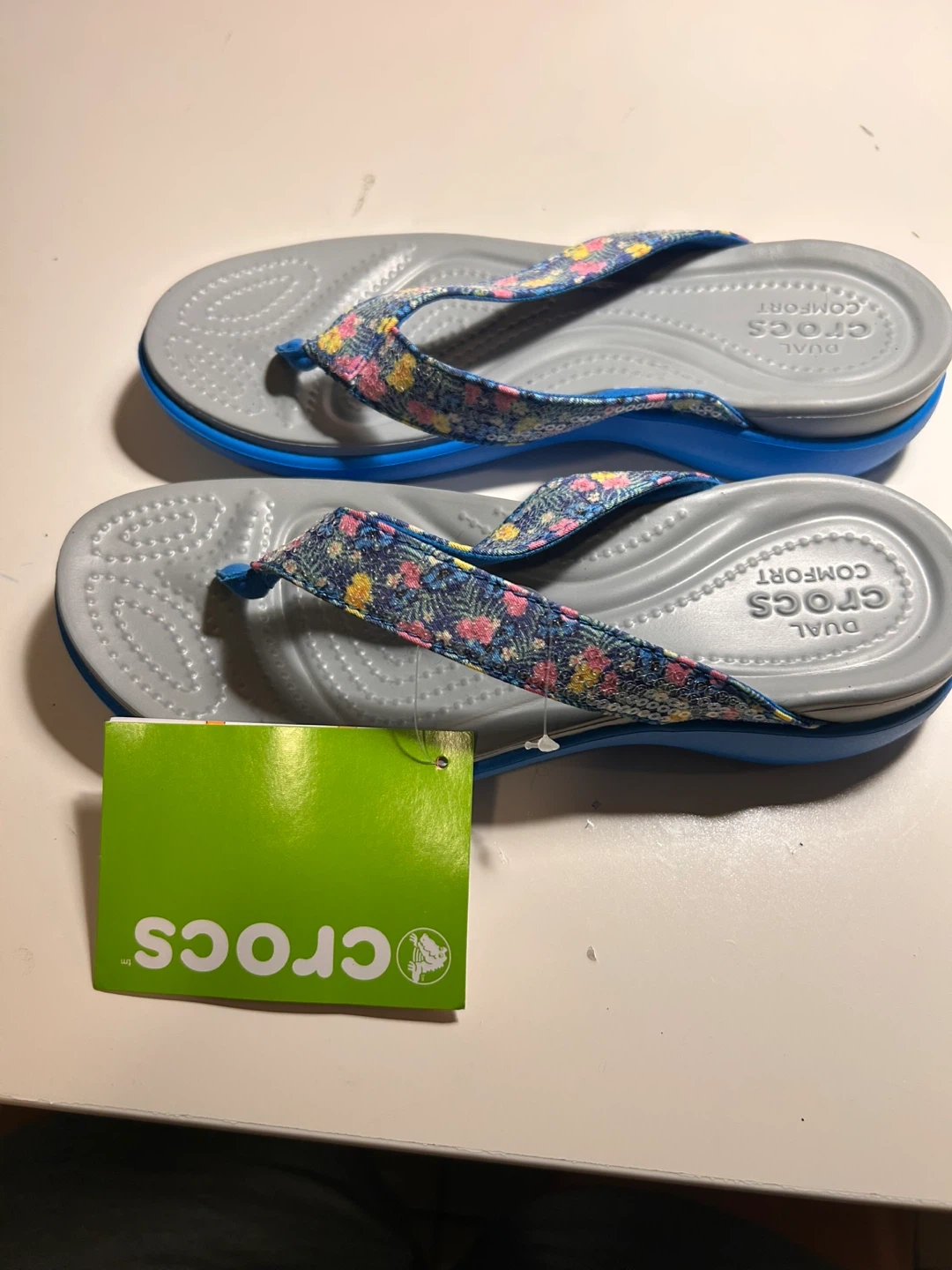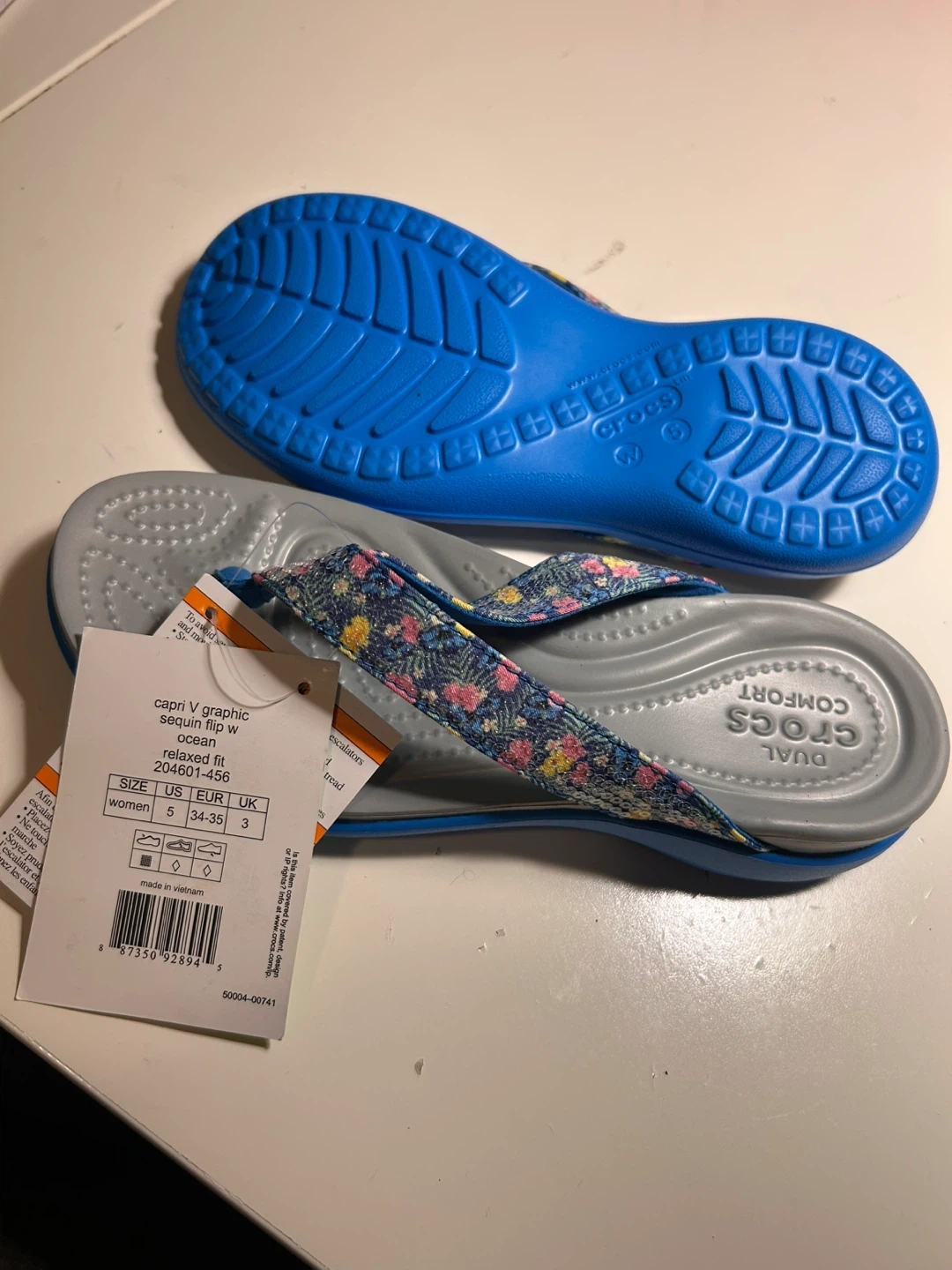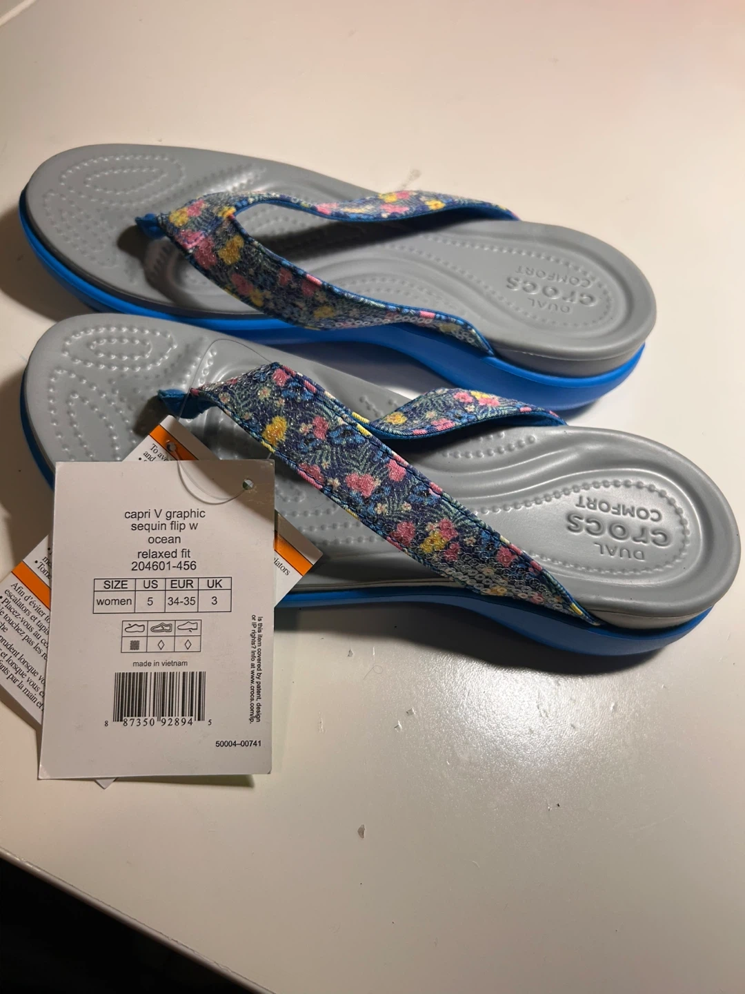 Style name: Capri V Graphic Sequin. Floral pattern with pink, yellow, and blue flowers.