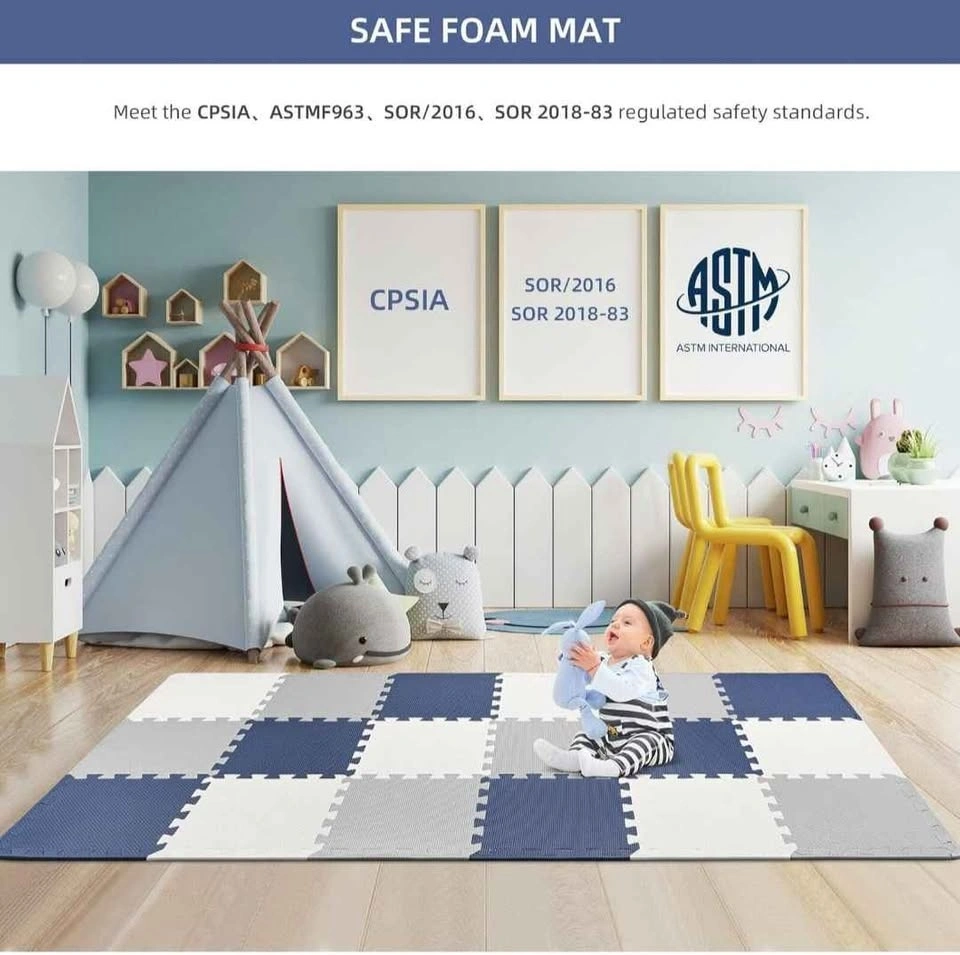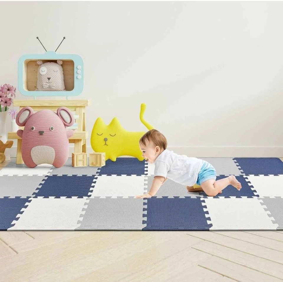 LIVINGBASICS Baby Play Mat, 0.39" Thin 18 pcs Puzzle. EVA Foam Exercise Play Mat with 1.62 Sqm Coverage. Interlocking Floor Tiles, Portable Crawling Floor Mats for Kids Toddler (Blue, Grey, White). The box was opened as seen in the picture but the mat was not used. Reason for selling: Wrong color. Pick up in Harmony and Rossland Oshawa. Cash only.