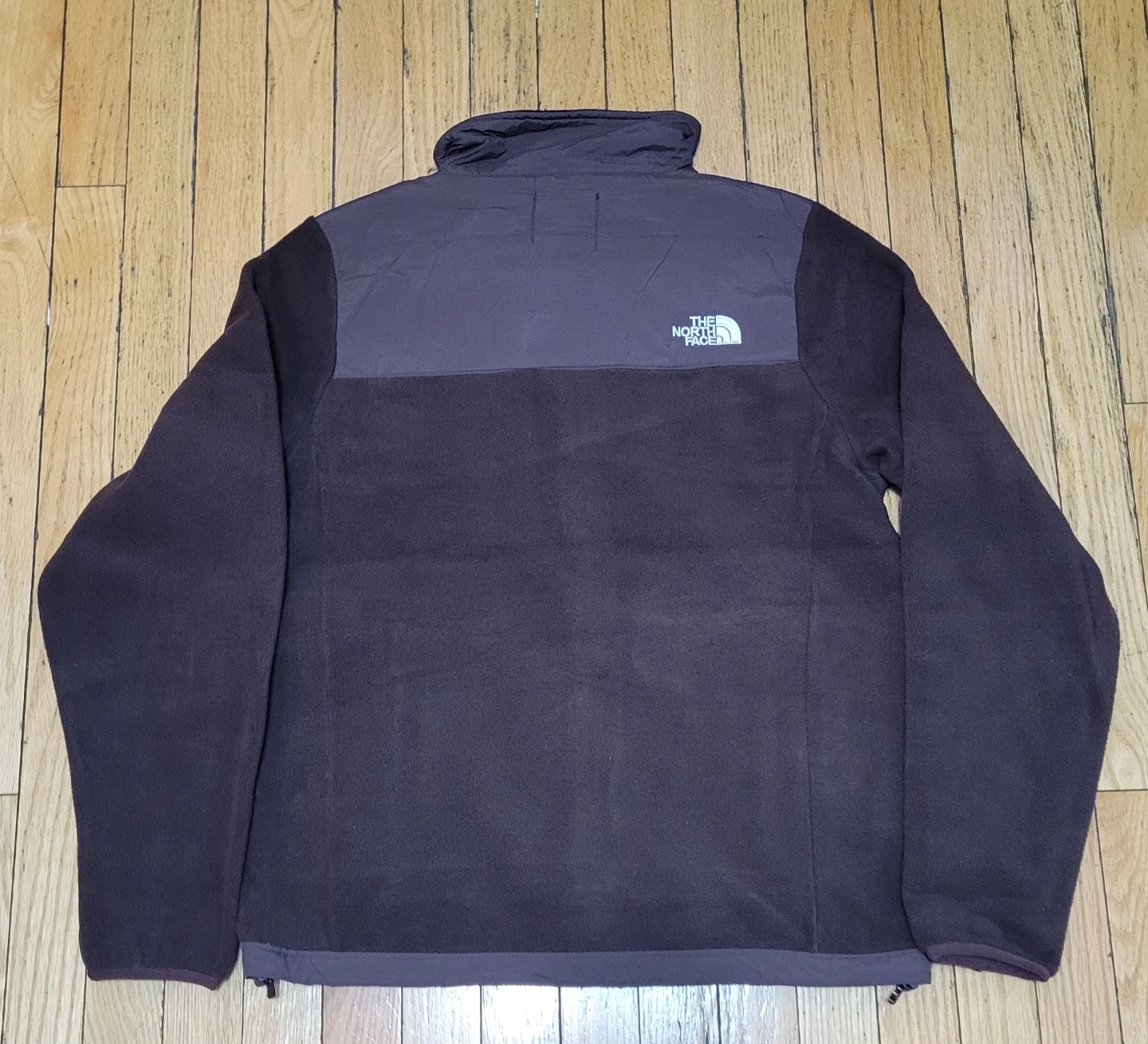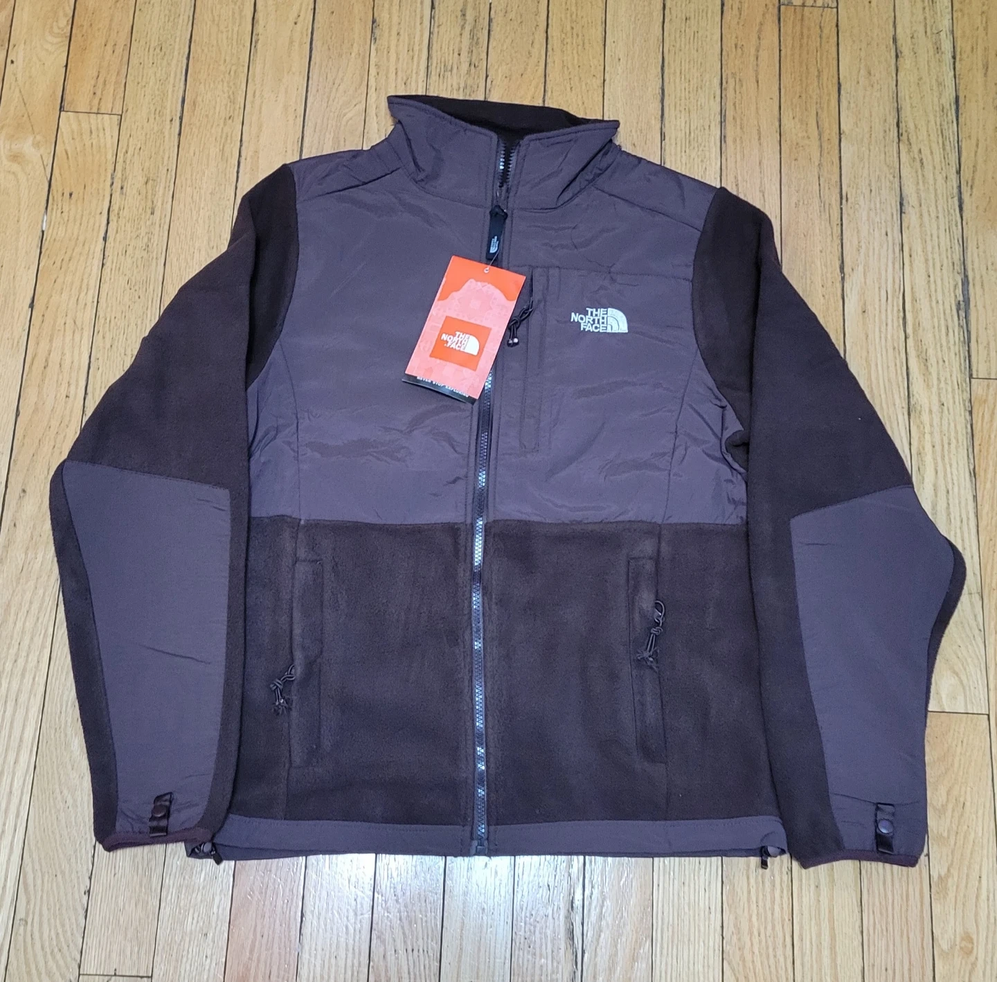 This is The North Face Denali Fleece Jacket in size medium. It's a full-zip jacket made of fleece material. It has a brown color scheme.