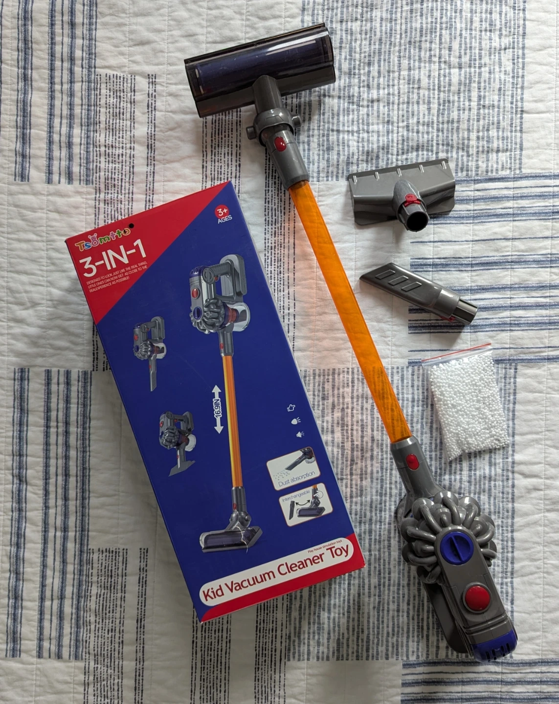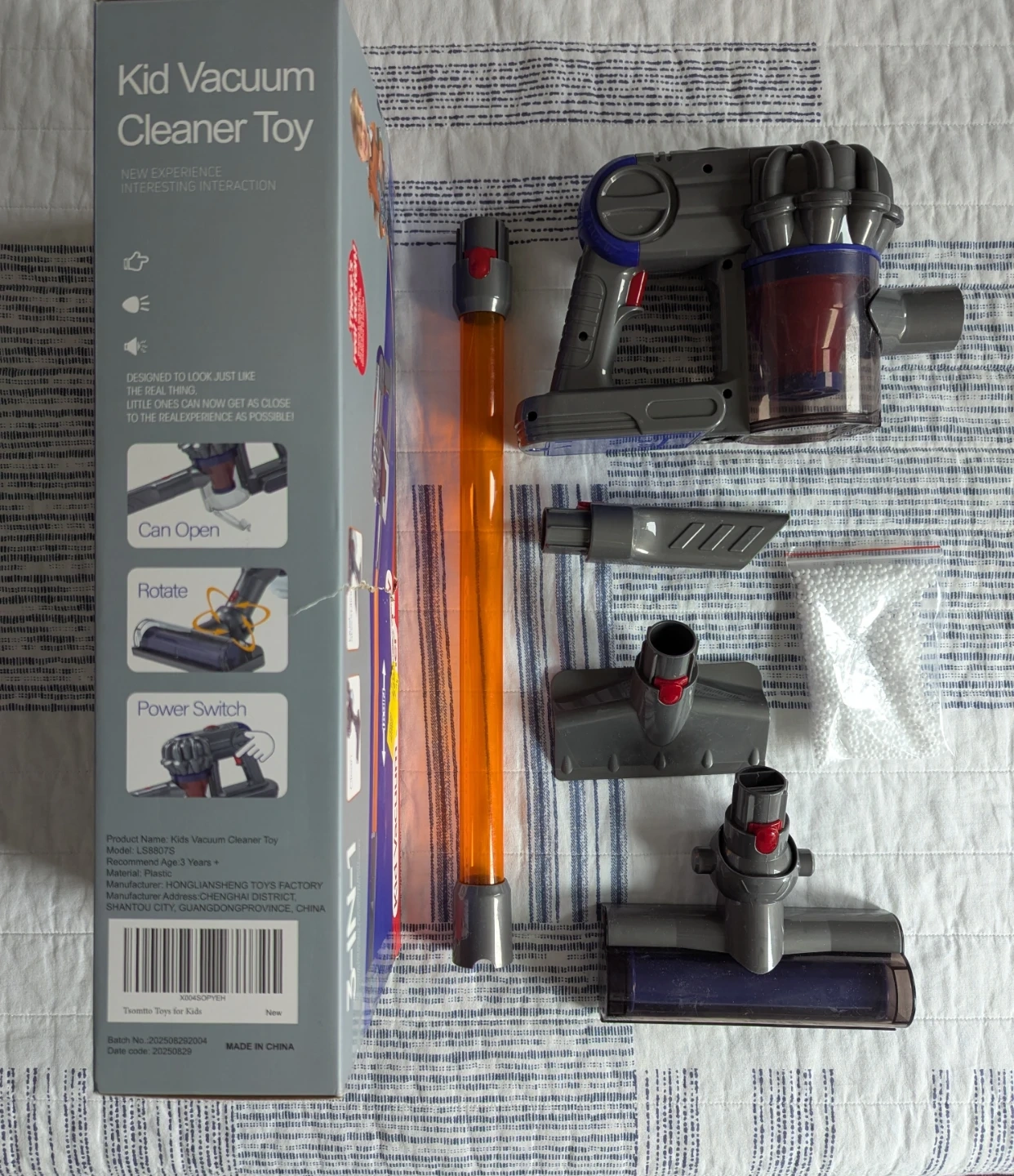 This is a kid's vacuum cleaner toy with multiple attachments. It's designed to look like a real vacuum and is recommended for ages 3 years and up. Includes small white beads for 'dust' play.