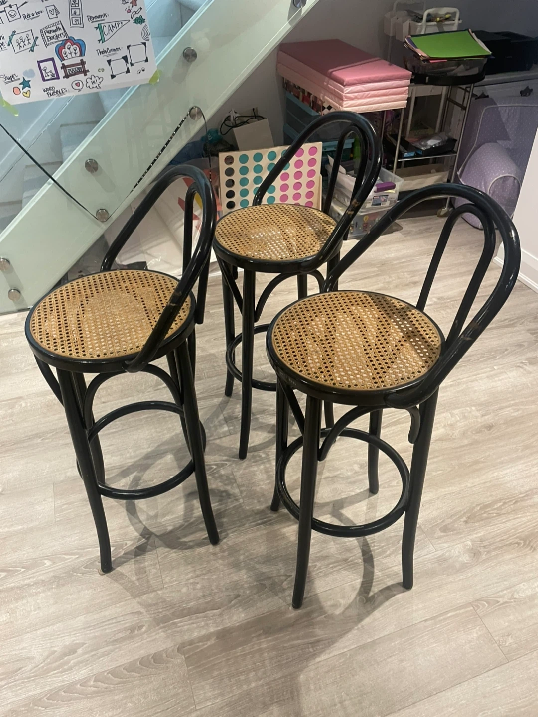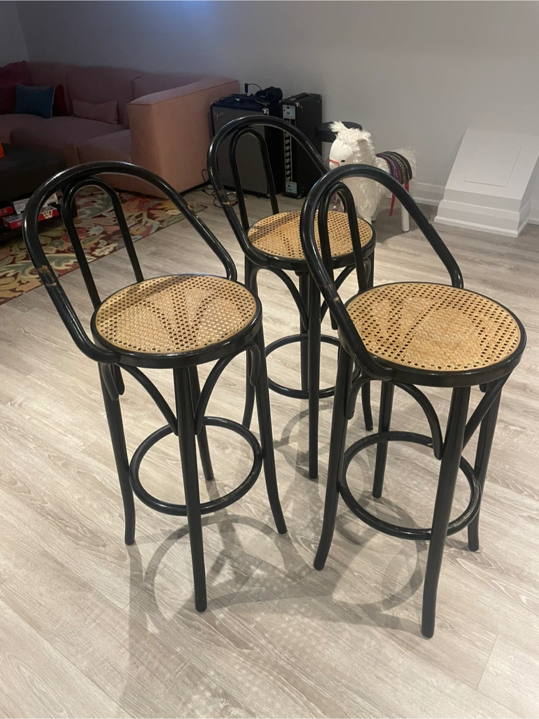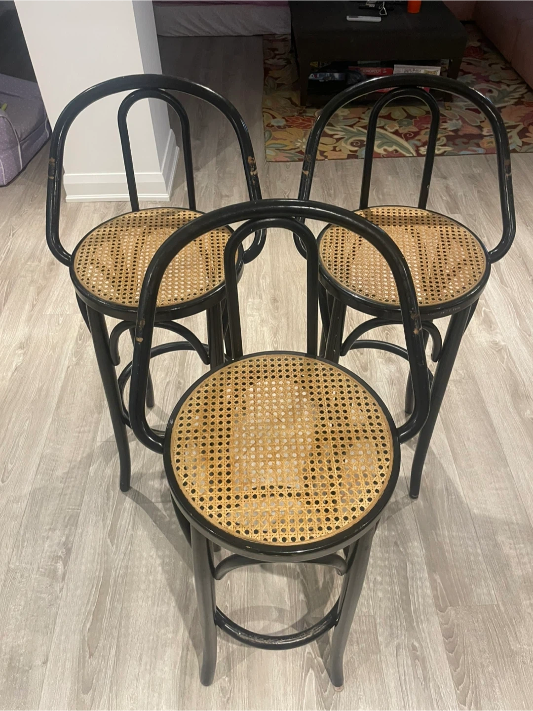 Three black bar stools featuring classic bentwood frames and woven cane seats. These chairs add a touch of vintage charm to any kitchen island or bar area. Sturdy construction with footrests.