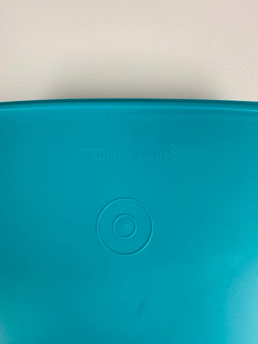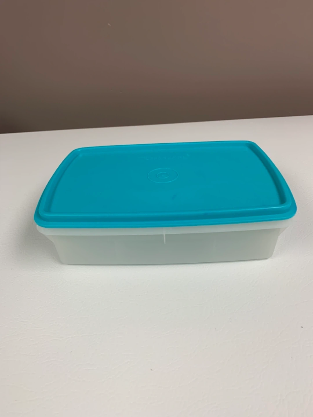 This is a Tupperware Modular Mates rectangular container. It's a clear base with a teal lid and includes a removable divider.