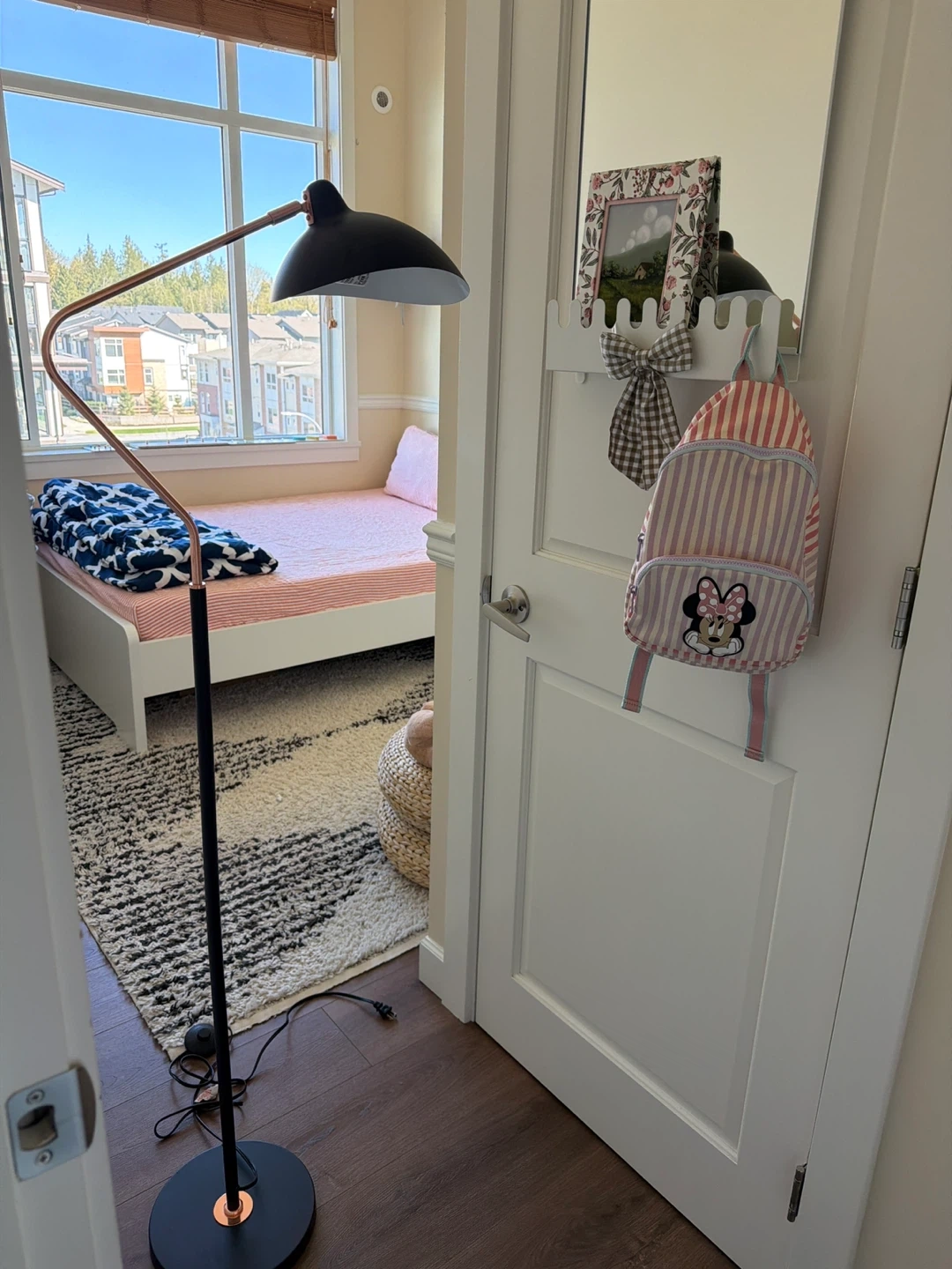 Stylish arc floor lamp with a black shade and copper accents. It's perfect for reading nooks or providing ambient light. The lamp has an adjustable arm and a sturdy base.