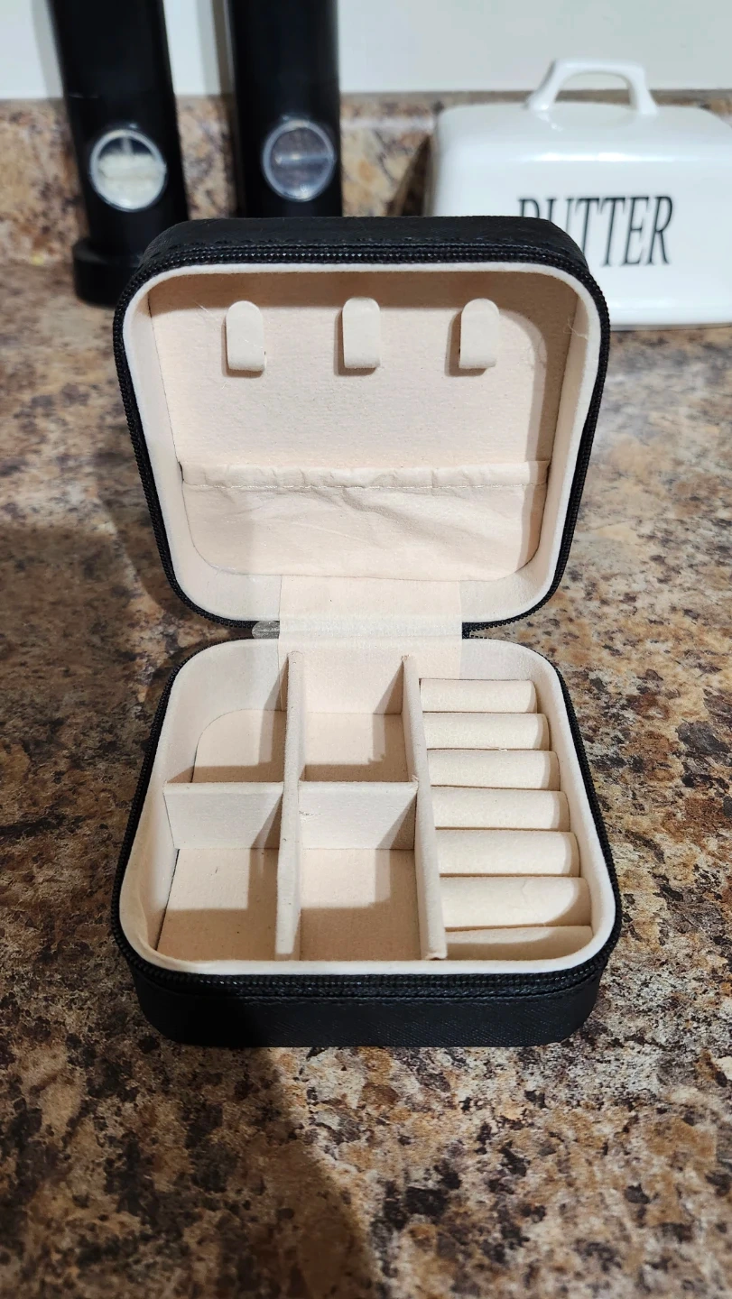 This black travel jewelry organizer is perfect for keeping your accessories tidy on the go. It's compact and features dedicated slots for rings and earrings, plus a larger compartment for necklaces or bracelets. Great for trips or everyday storage!