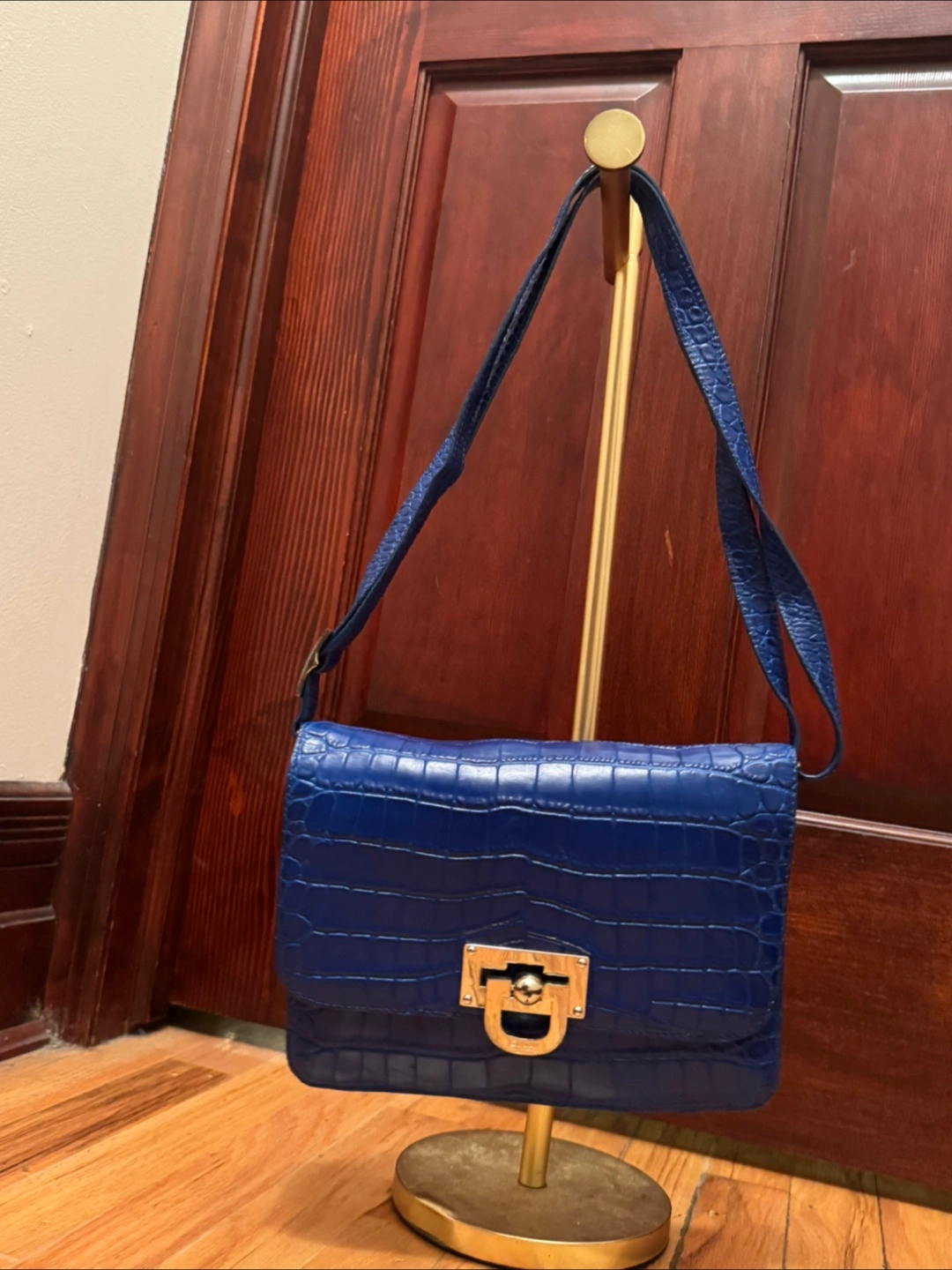 This is a cute blue shoulder bag from DKNY! It has a croc texture and a gold clasp. It's in great condition and perfect for everyday use