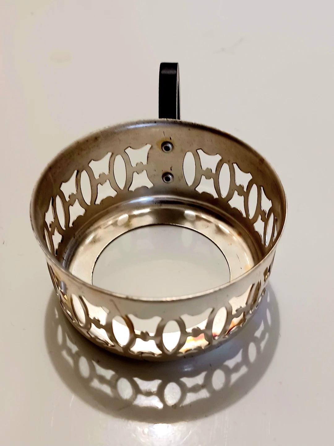 Vintage 1970s charming set of Six Kim S.P. Brass and glass cups, perfect for adding a touch of vintage elegance to your beverage service. These feature a unique design with ornate silver-plated brass holders and sleek black handles.