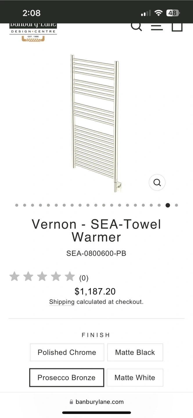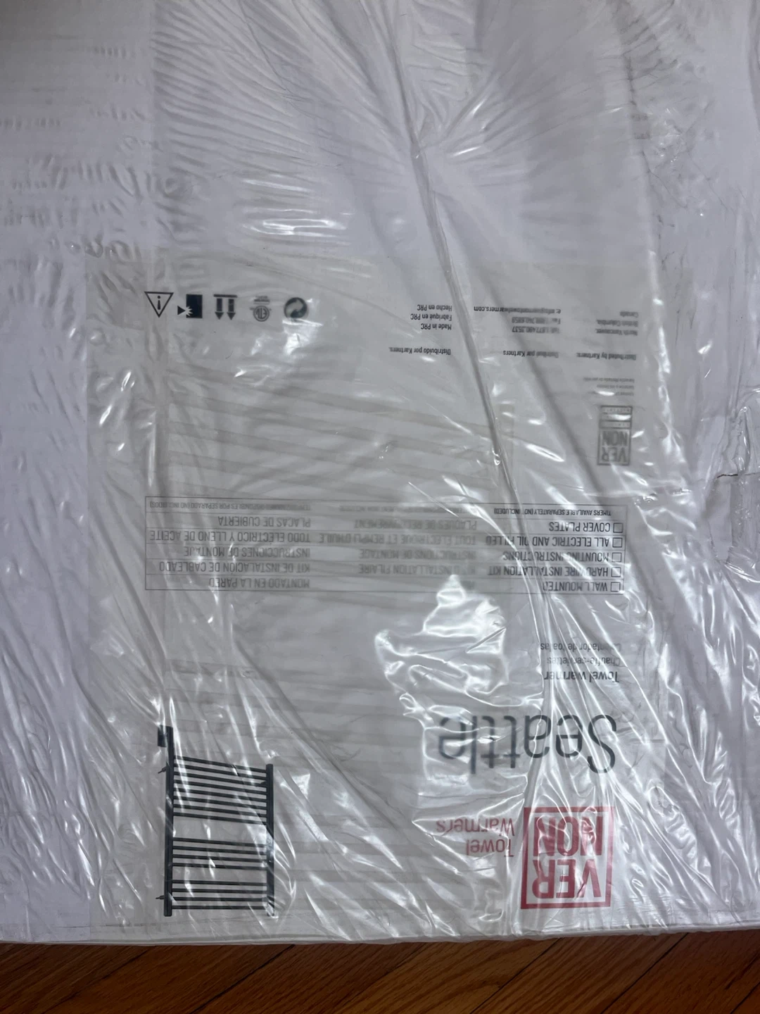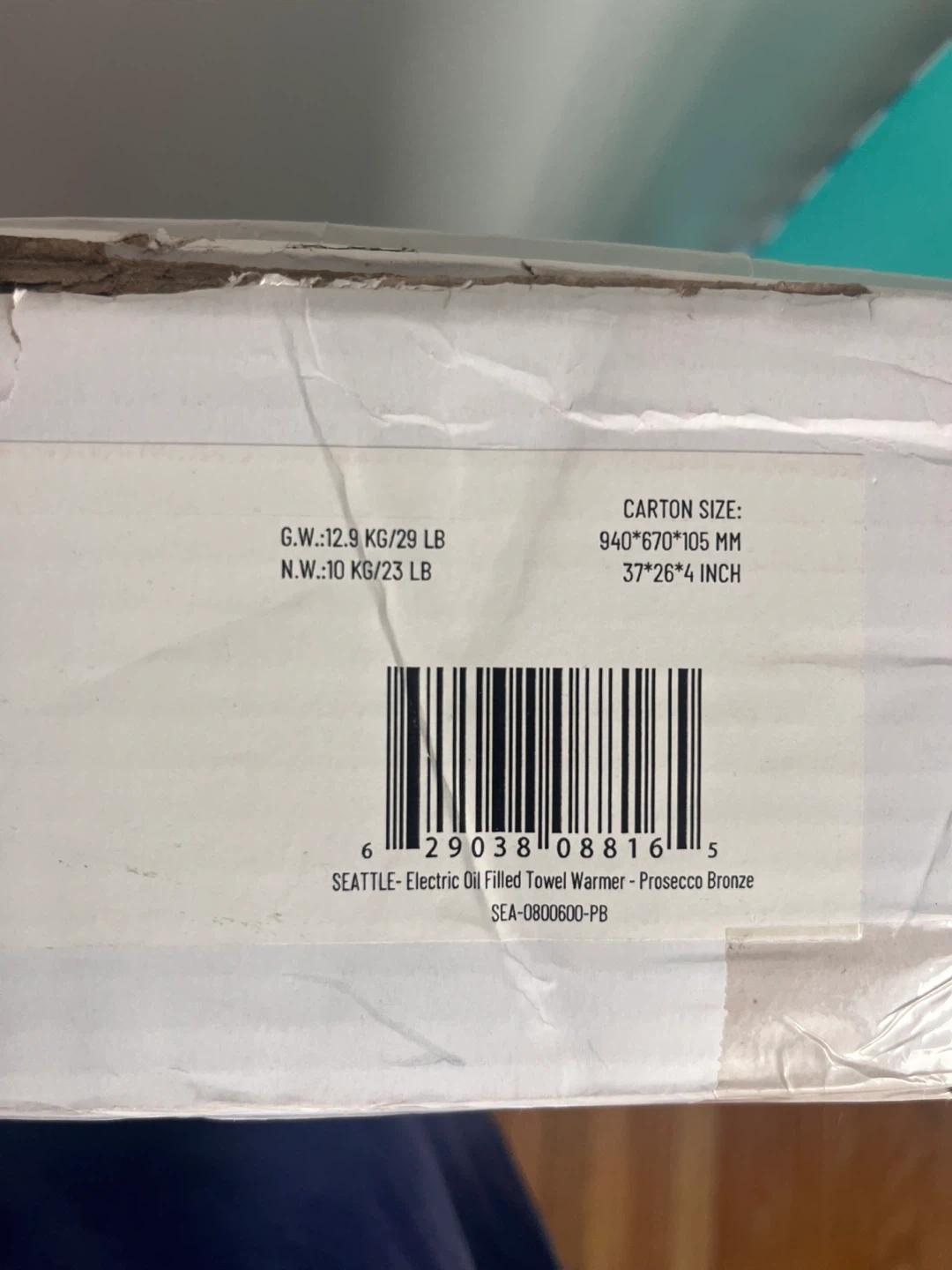 SEATTLE Electric Oil Filled Towel Warmer. Model SEA-0800600-PB. Carton size is 940*670*105 MM. This towel warmer is oil-filled and designed for electric use. It comes in a Prosecco Bronze finish.