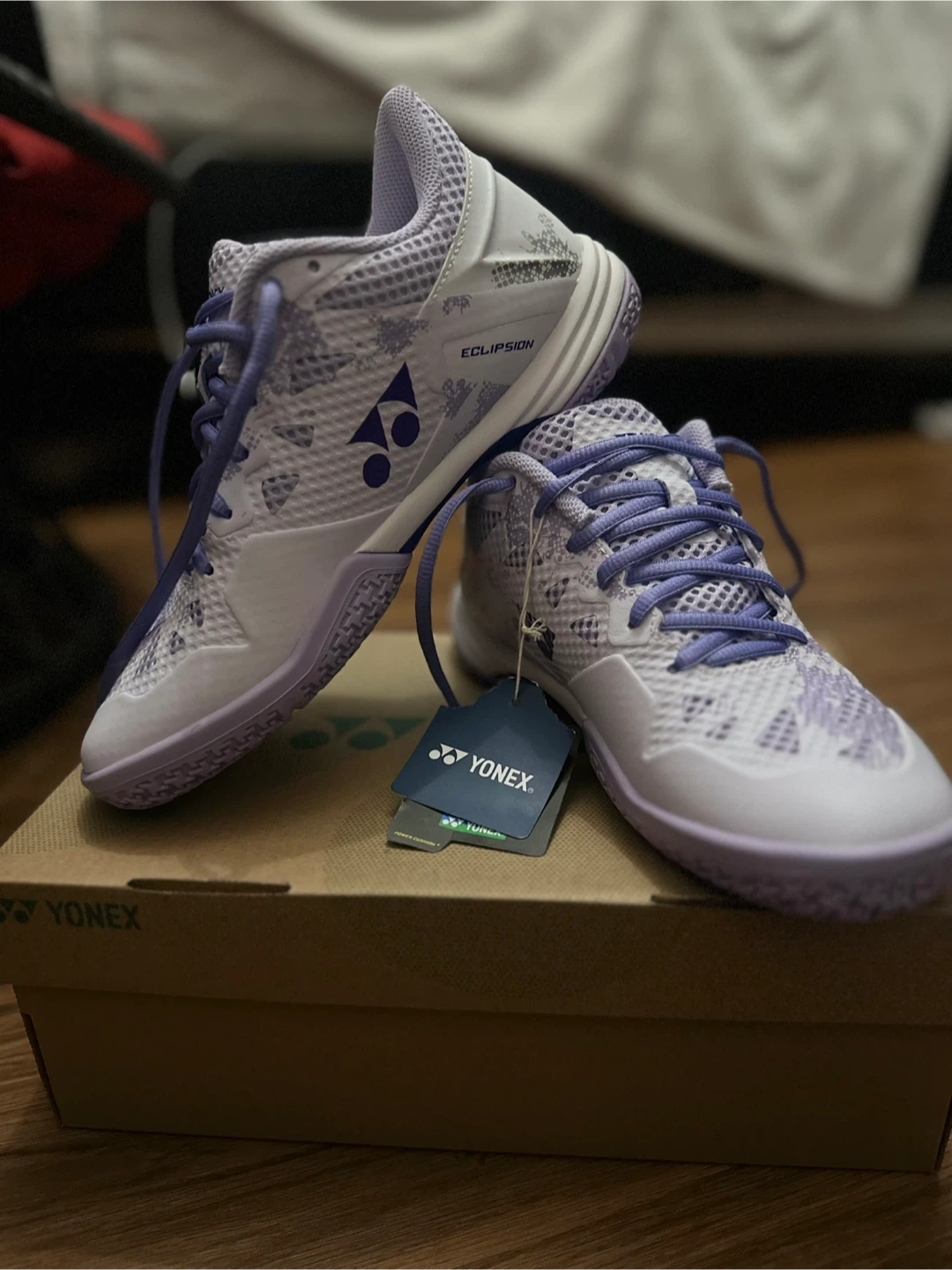 These are Yonex Eclipsion badminton shoes in a white and purple colourway. They're designed for court sports. The shoes have a breathable mesh upper and a durable rubber sole.