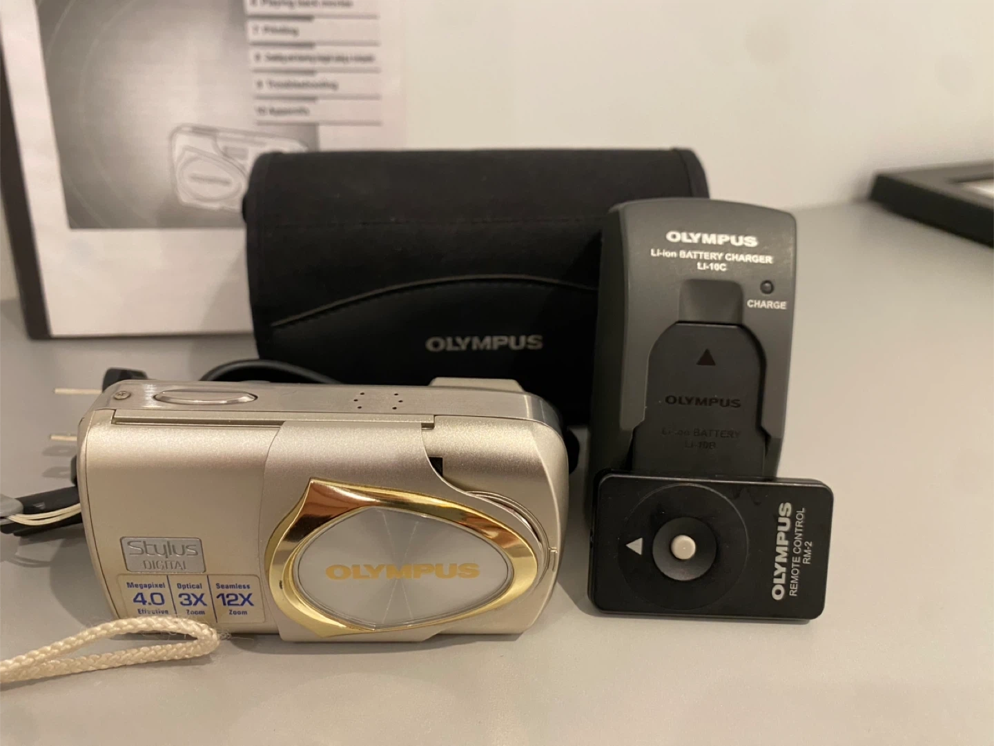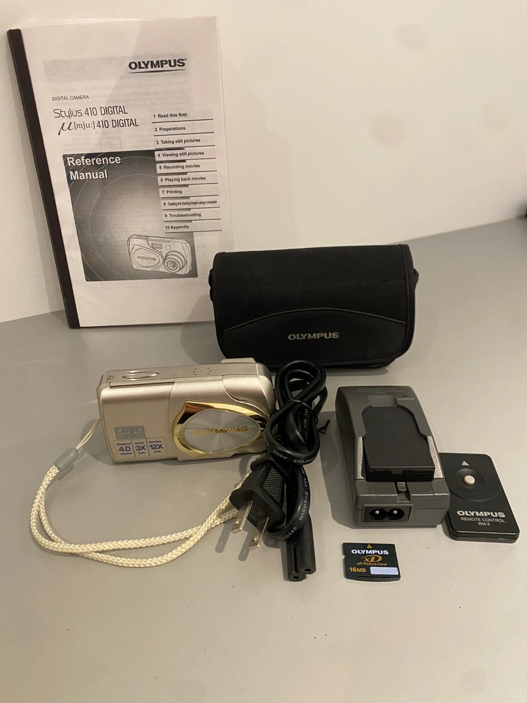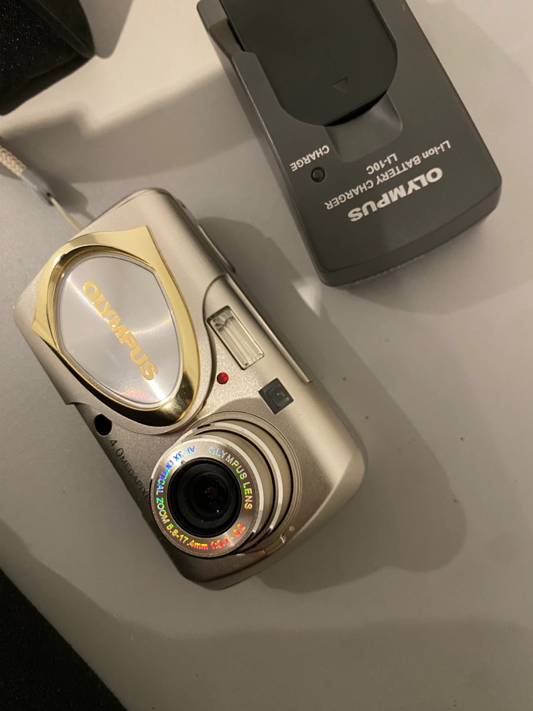 Camera includes original LI-10B rechargeable battery along with new spare battery, original Olympus plug in wall charger LI-10C with original AV plug in cord for fast charging.
