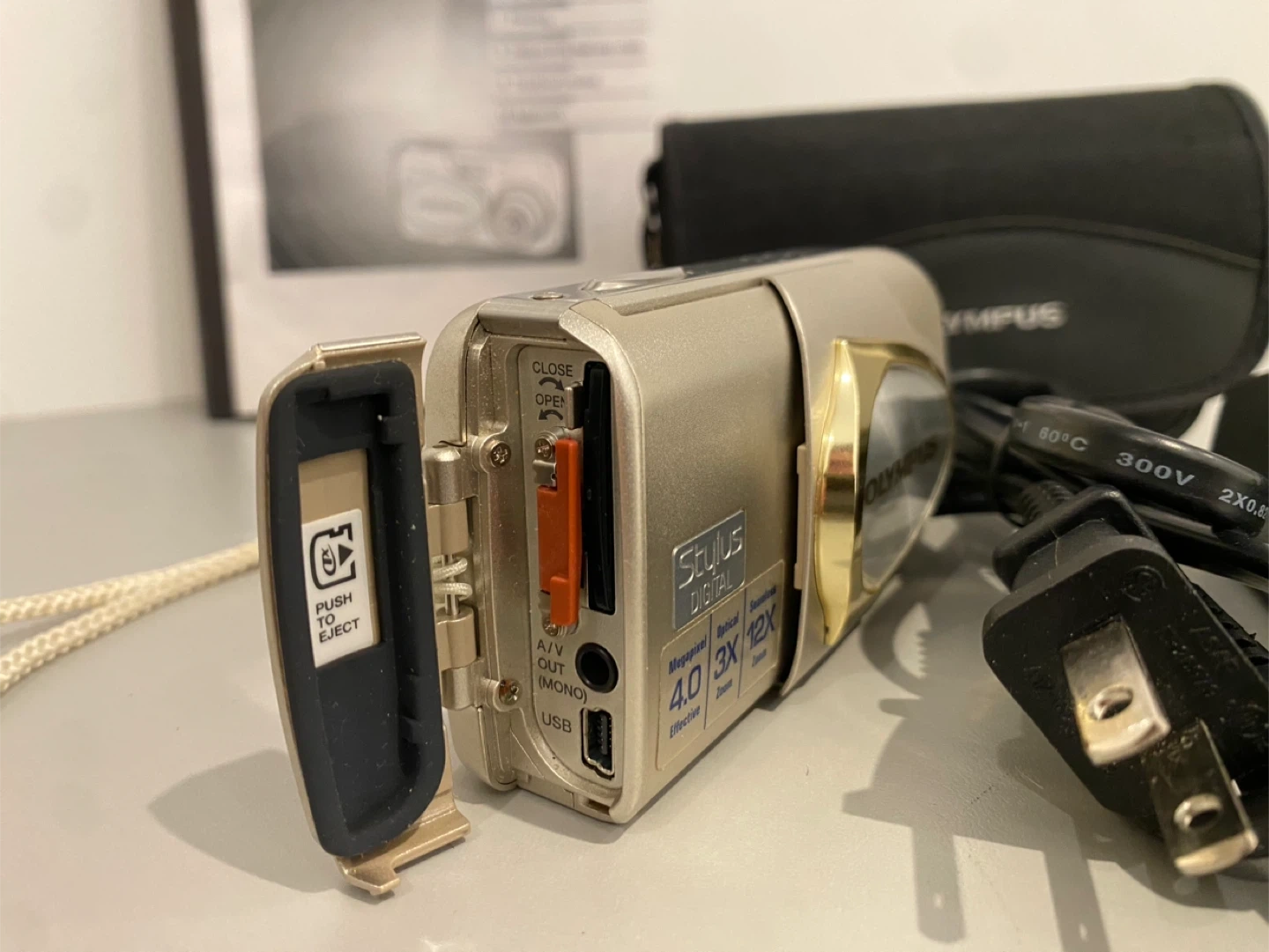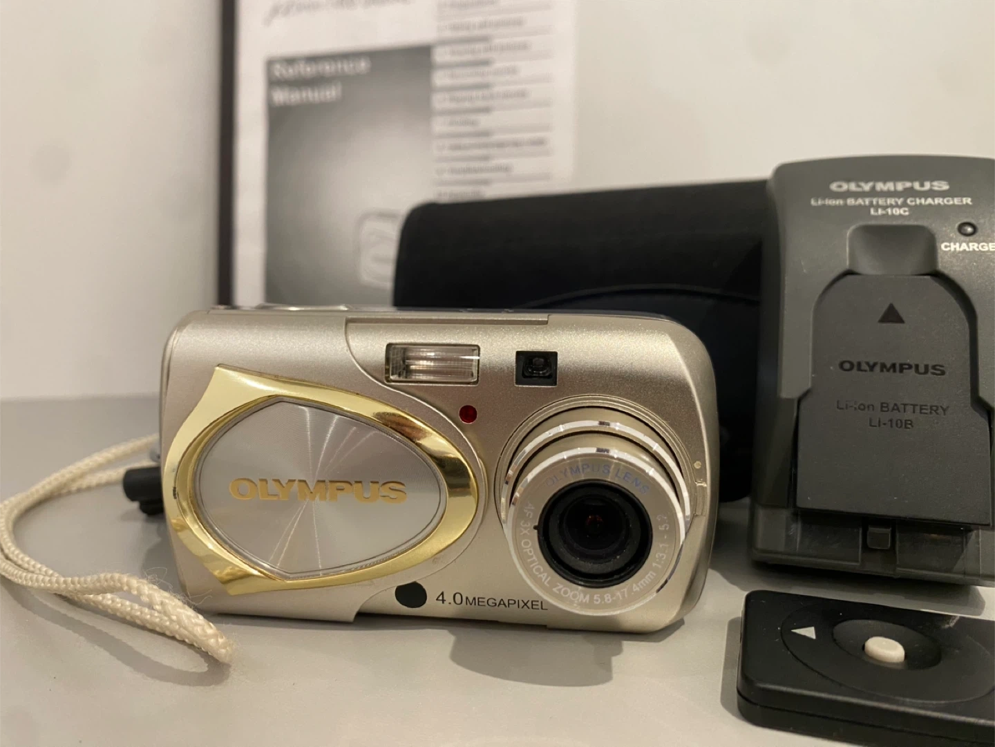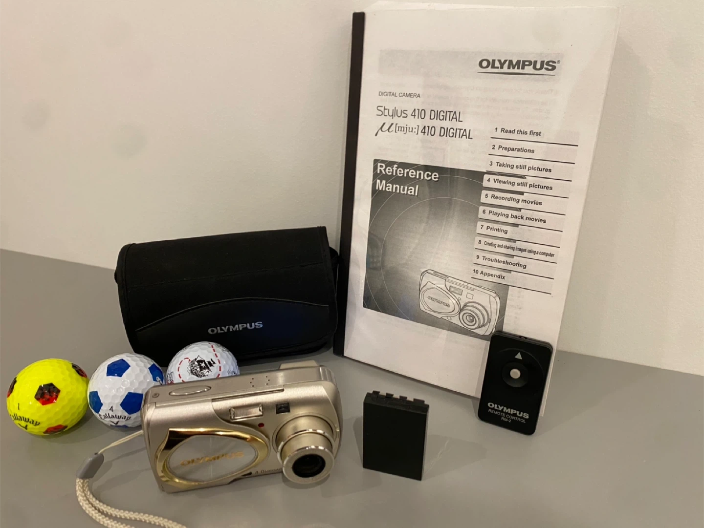 Camera includes original LI-10B rechargeable battery along with new spare battery, original Olympus plug in wall charger LI-10C with original AV plug in cord for fast charging.