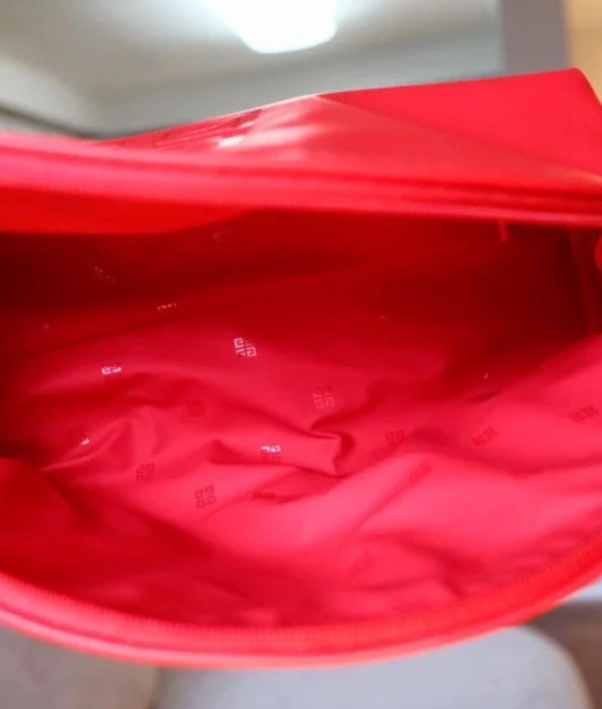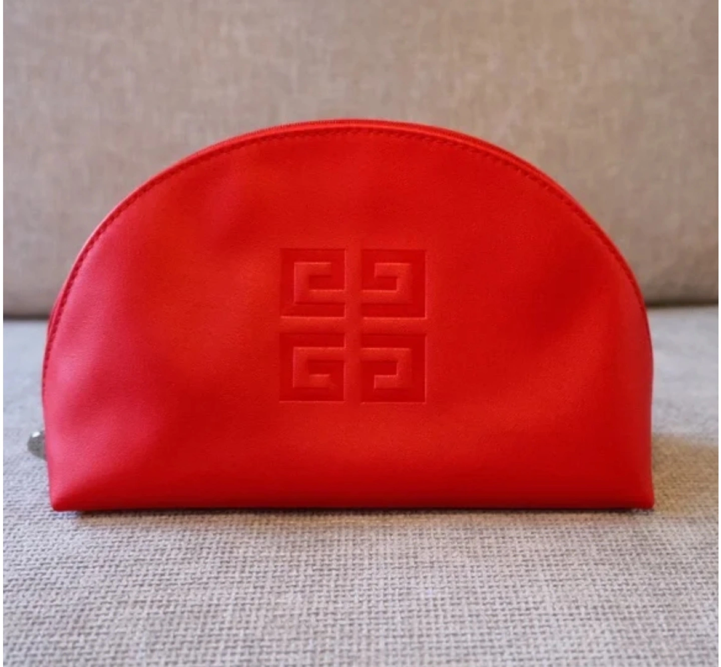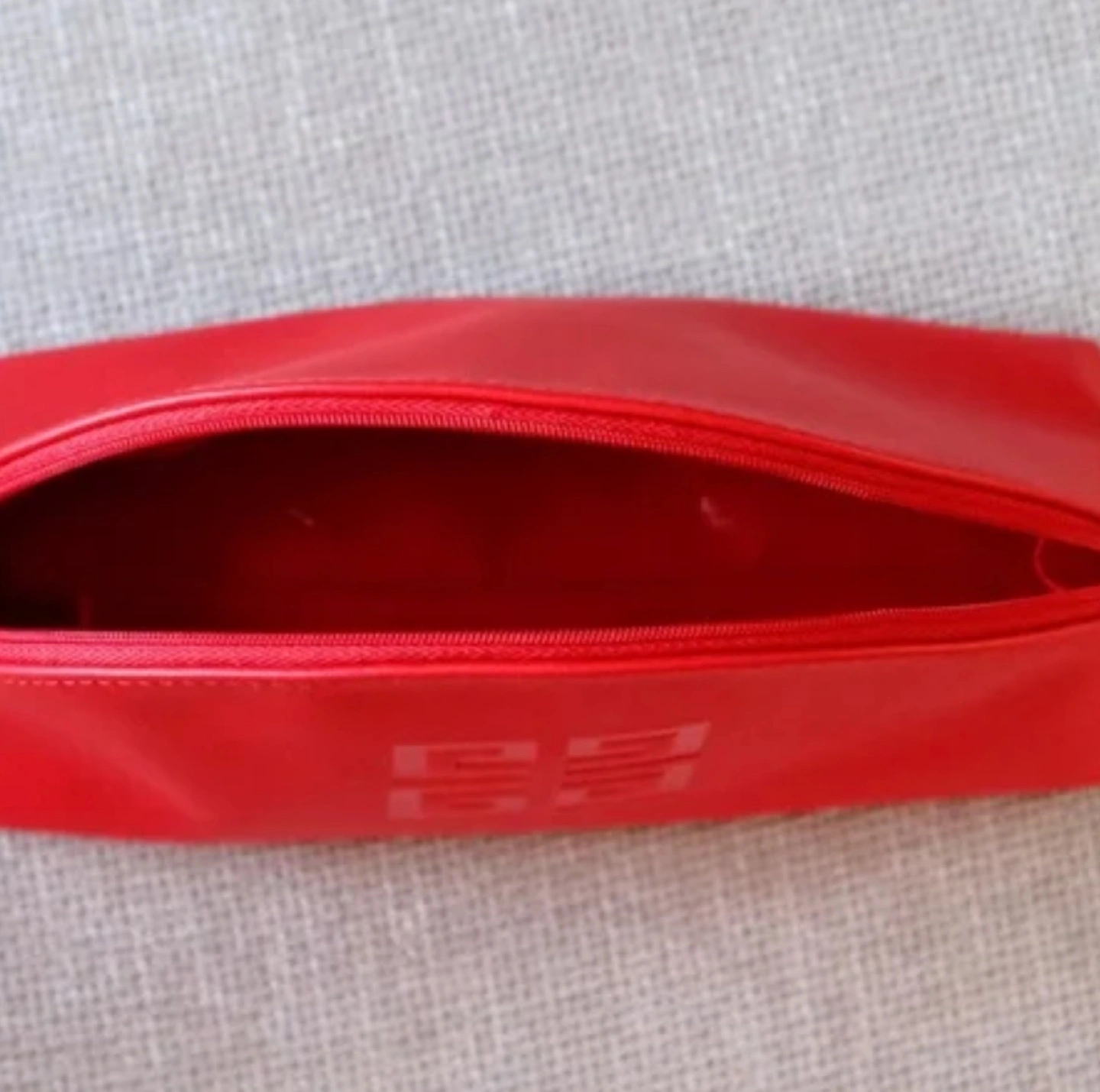 Authentic Givenchy Red leather cosmetic bag. Features a zipper closure and Givenchy logo. Compact and lightweight. You can use it as a clutch. Added screws and straps to turn it into a bag.