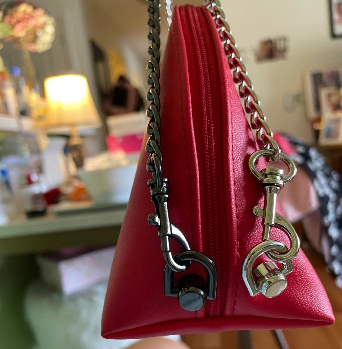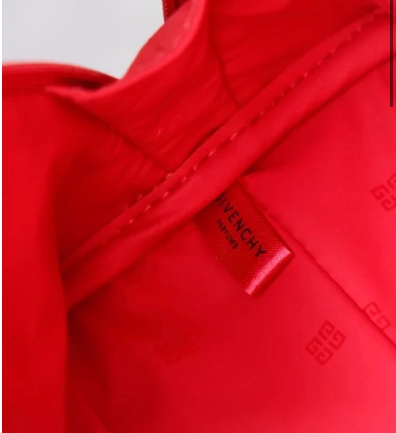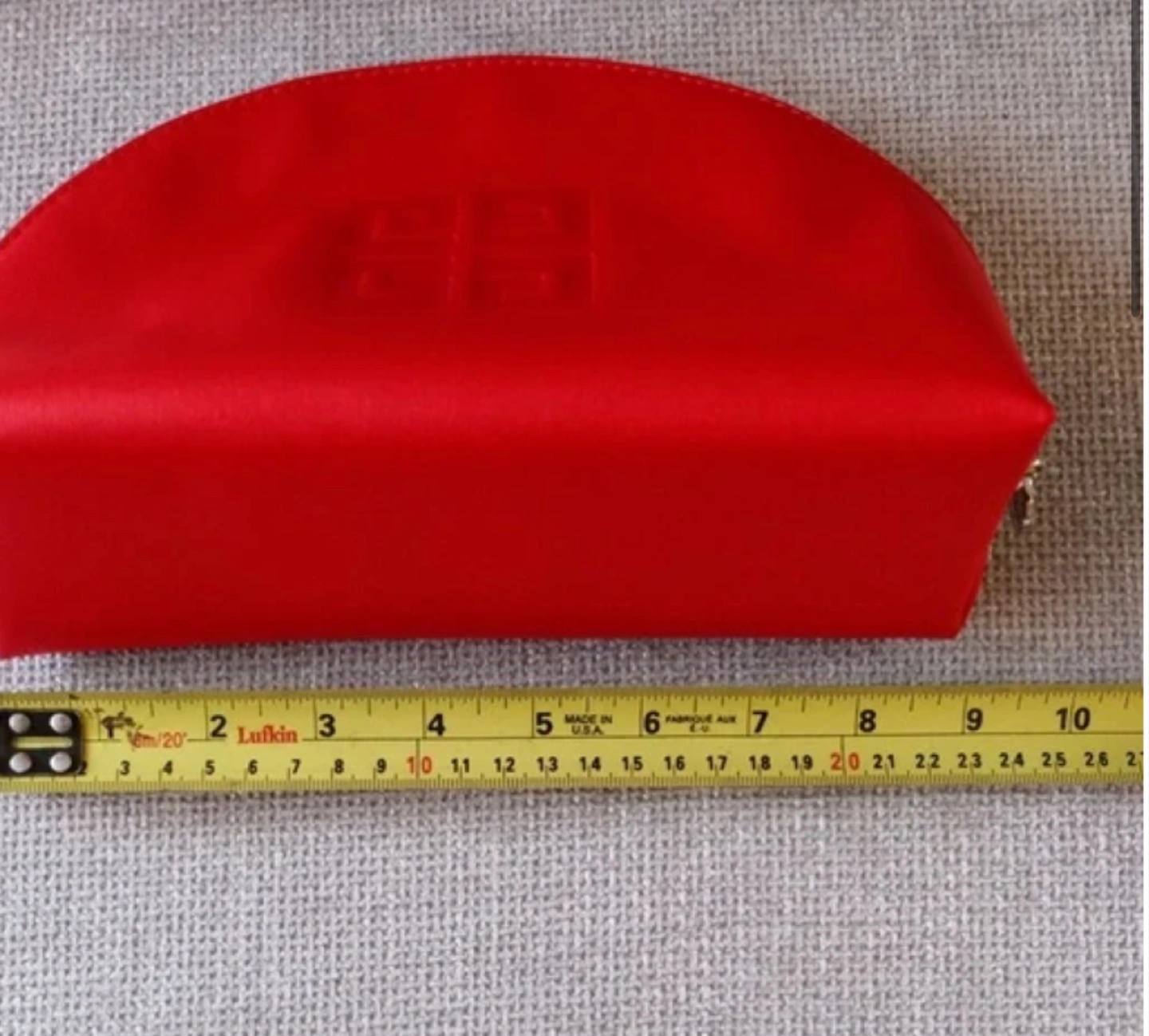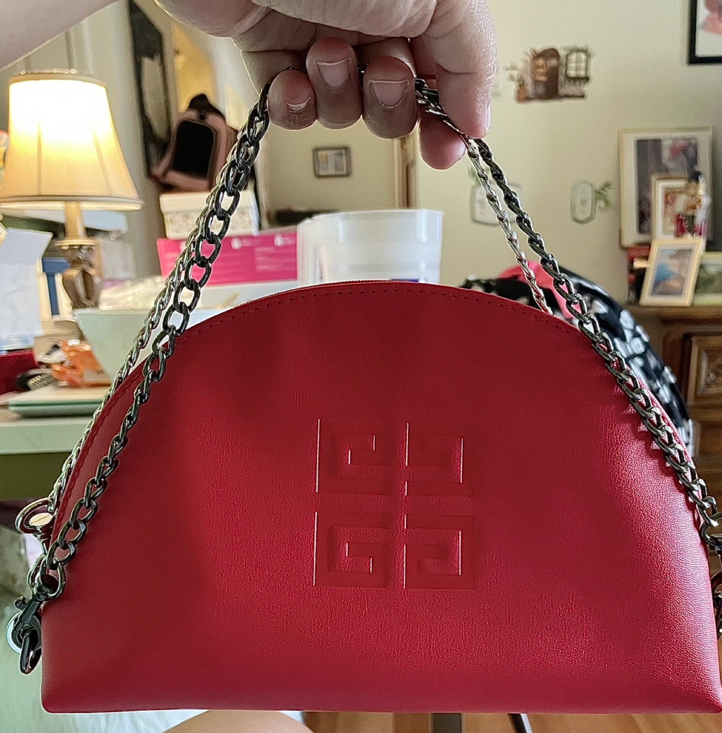 Authentic Givenchy Red leather cosmetic bag. Features a zipper closure and Givenchy logo. Compact and lightweight. You can use it as a clutch. Added screws and straps to turn it into a bag.