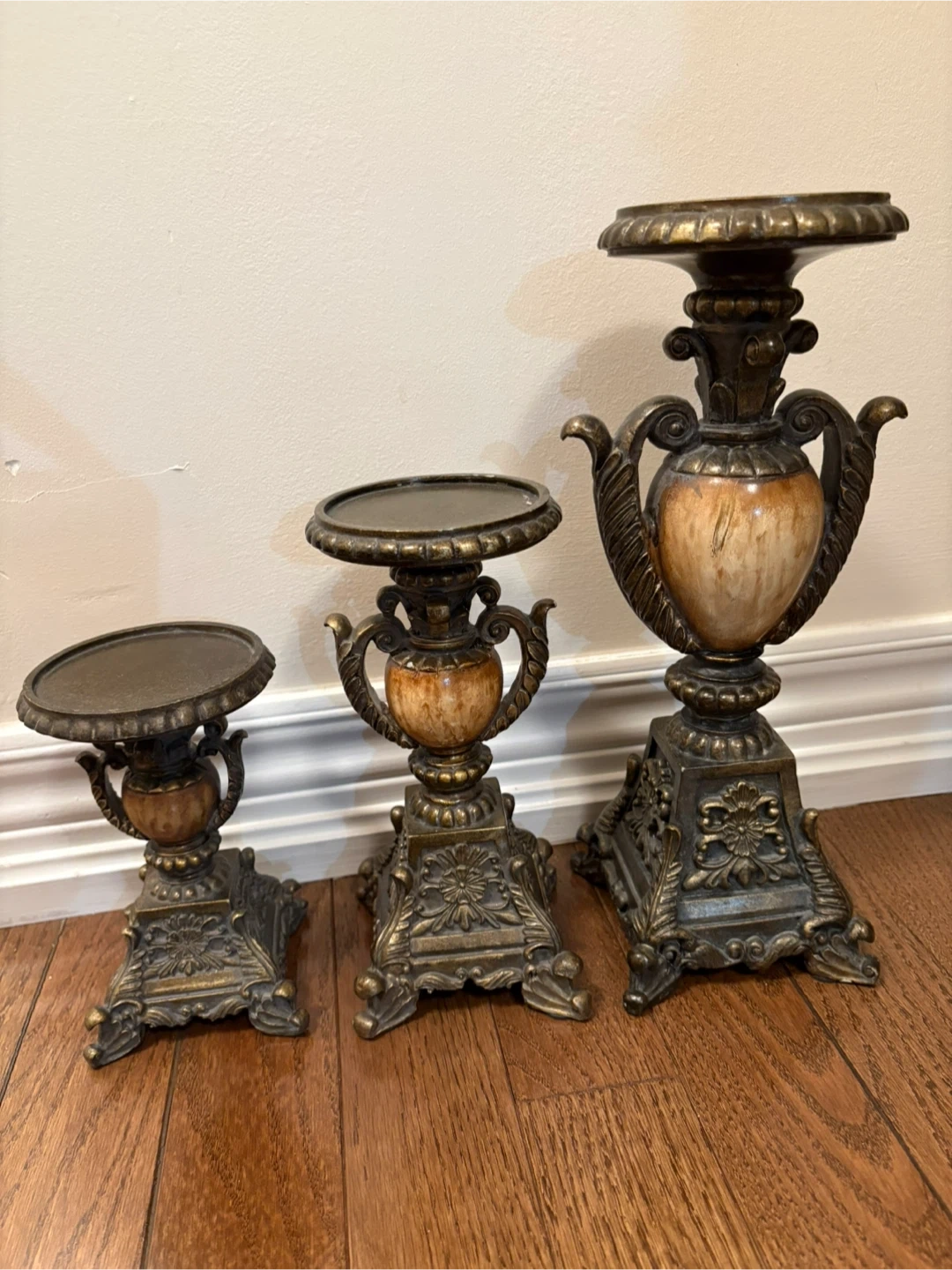 Selling a set of three vintage candle holders. They have a beautiful, ornate design with a bronze and cream colour scheme. They add a touch of elegance to any room!