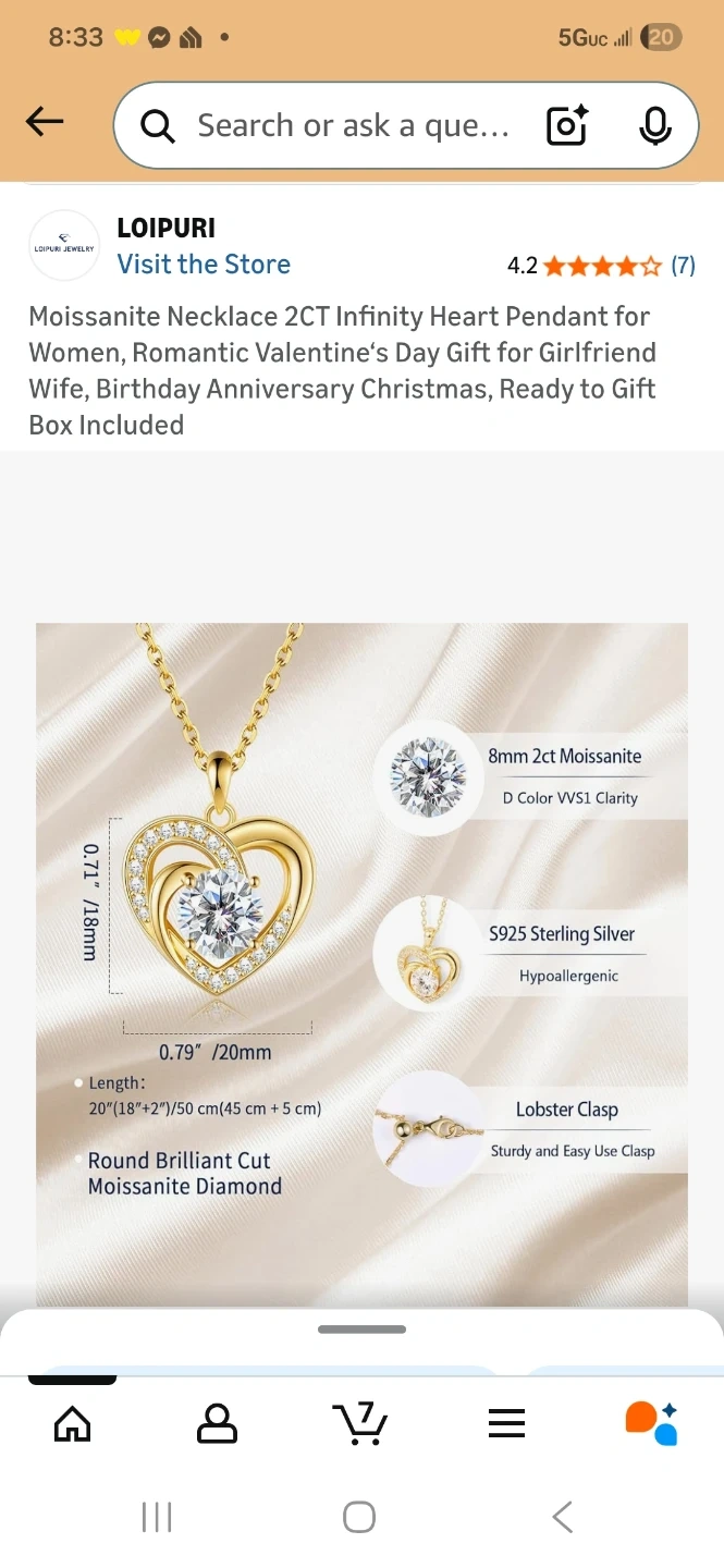 This LOIPURI necklace features an 8mm 2ct Moissanite diamond. It's crafted from S925 Sterling Silver and is hypoallergenic. The chain length is adjustable from 18 to 20 inches with a lobster clasp. Includes gift box.