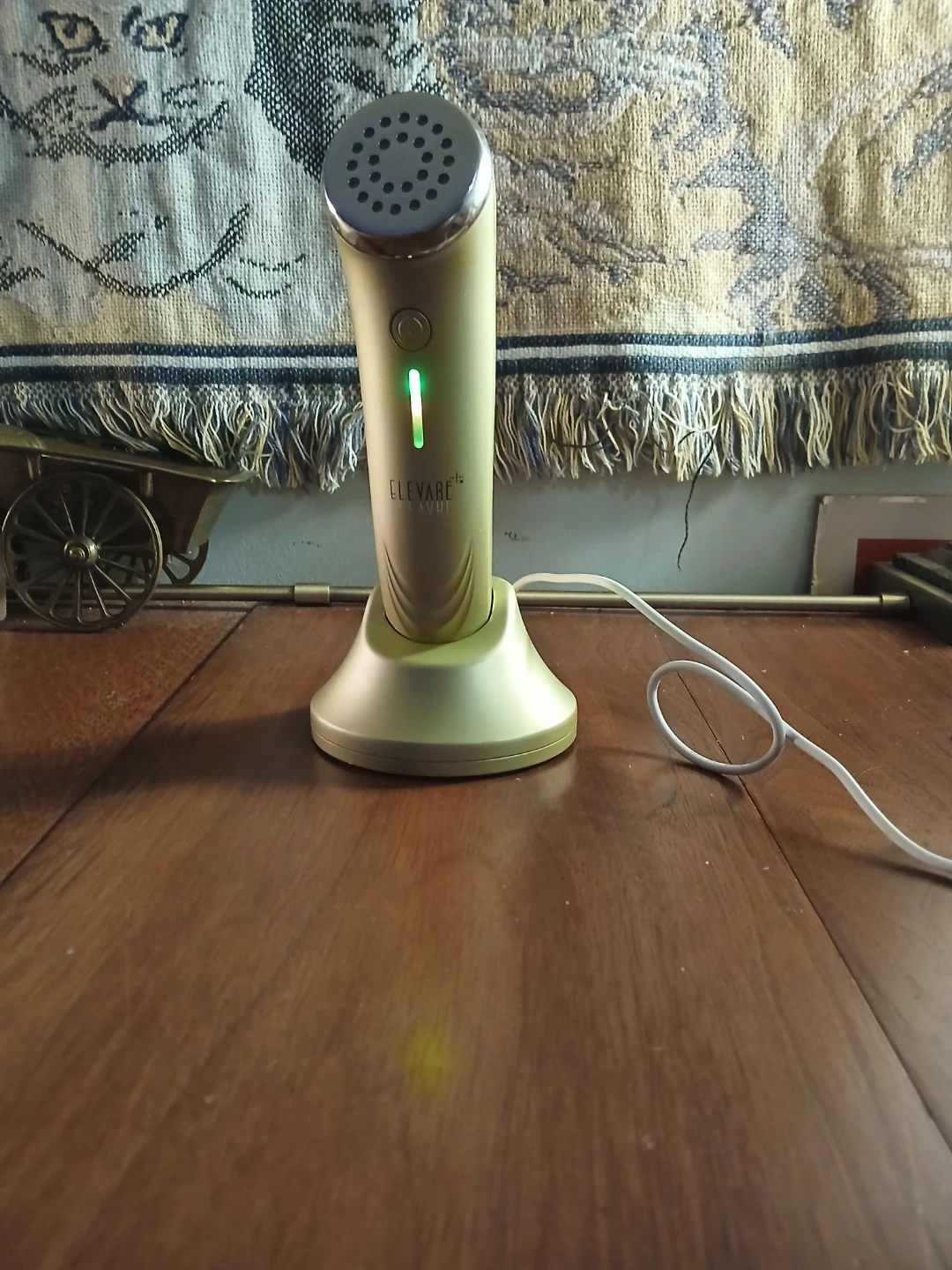 This is an ELEVARE AGE REVERSE facial wand. It comes with its charging base and power adapter. The device has a green indicator light when in use.