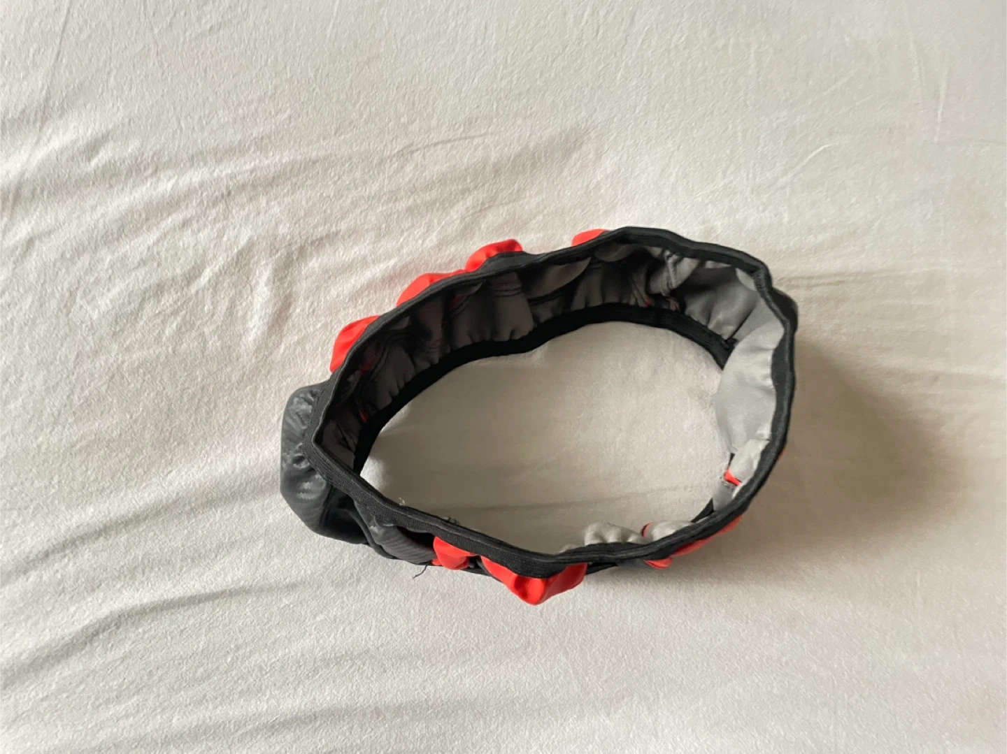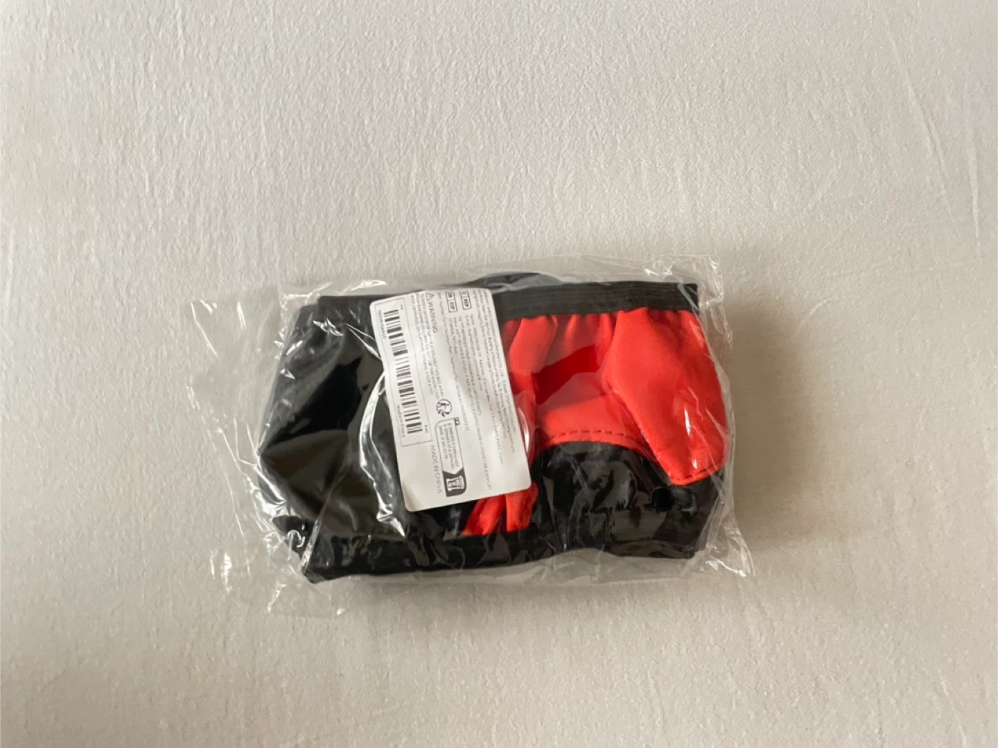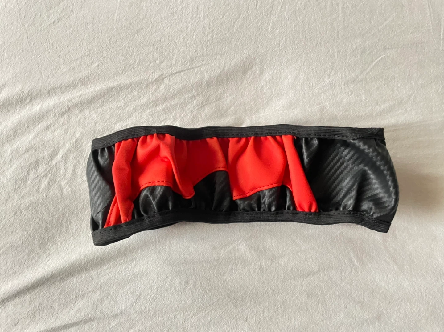 This steering wheel cover has a carbon fiber look on the sides and red fabric accents. It's made of durable material and comes in its original packaging. The elastic band ensures a snug fit on most steering wheels.