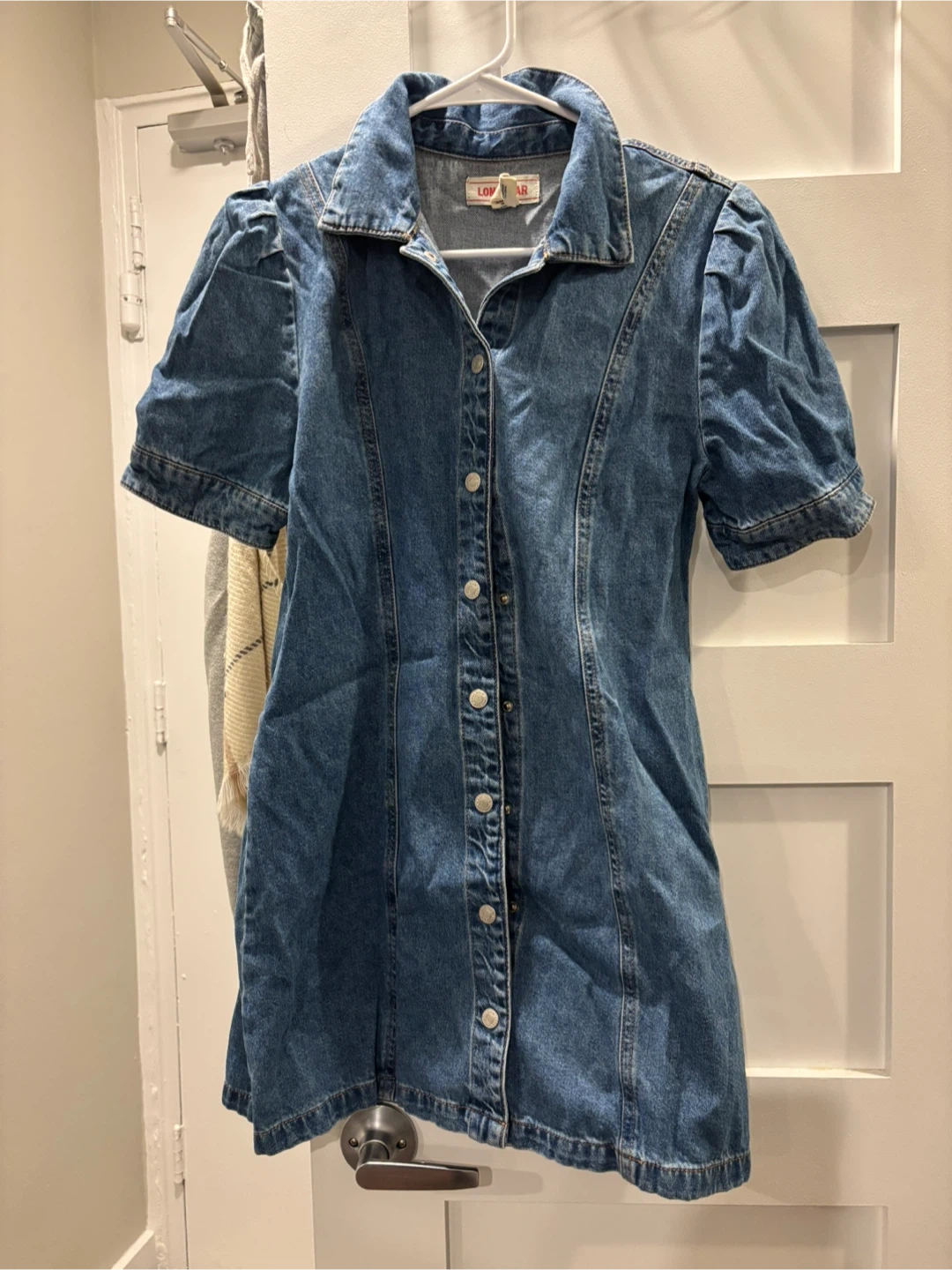 This LOW VINTAGE denim dress features a classic button-front design and stylish puff sleeves. It's made from durable denim fabric. A great casual piece for any wardrobe!