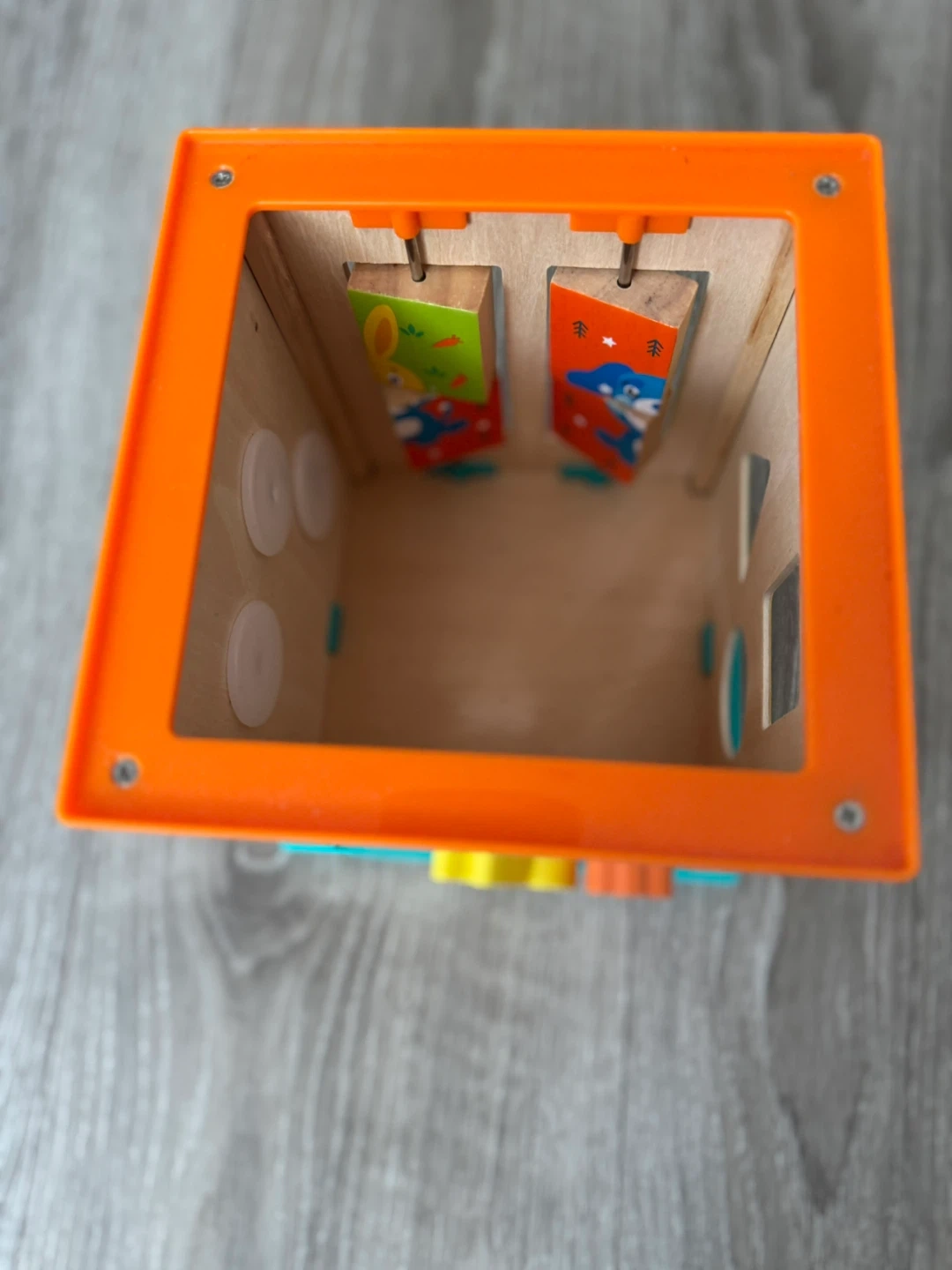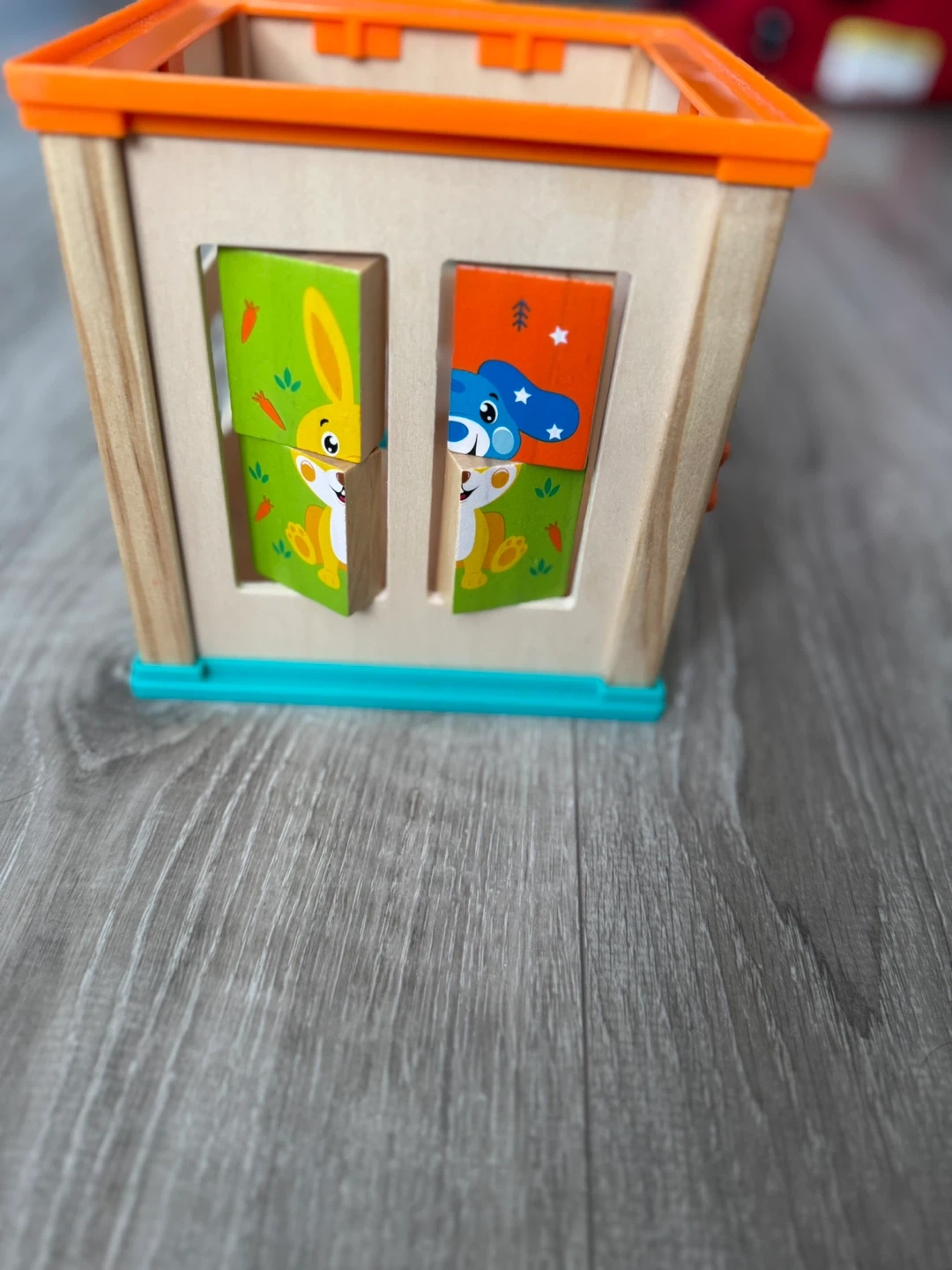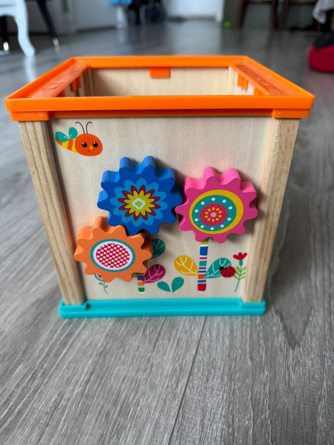 wooden activity cube features gears, shape sorting, and doors with peek-a-boo bunnies. It's made of wood with colourful accents. This toy is great for developing fine motor skills and hand-eye coordination..