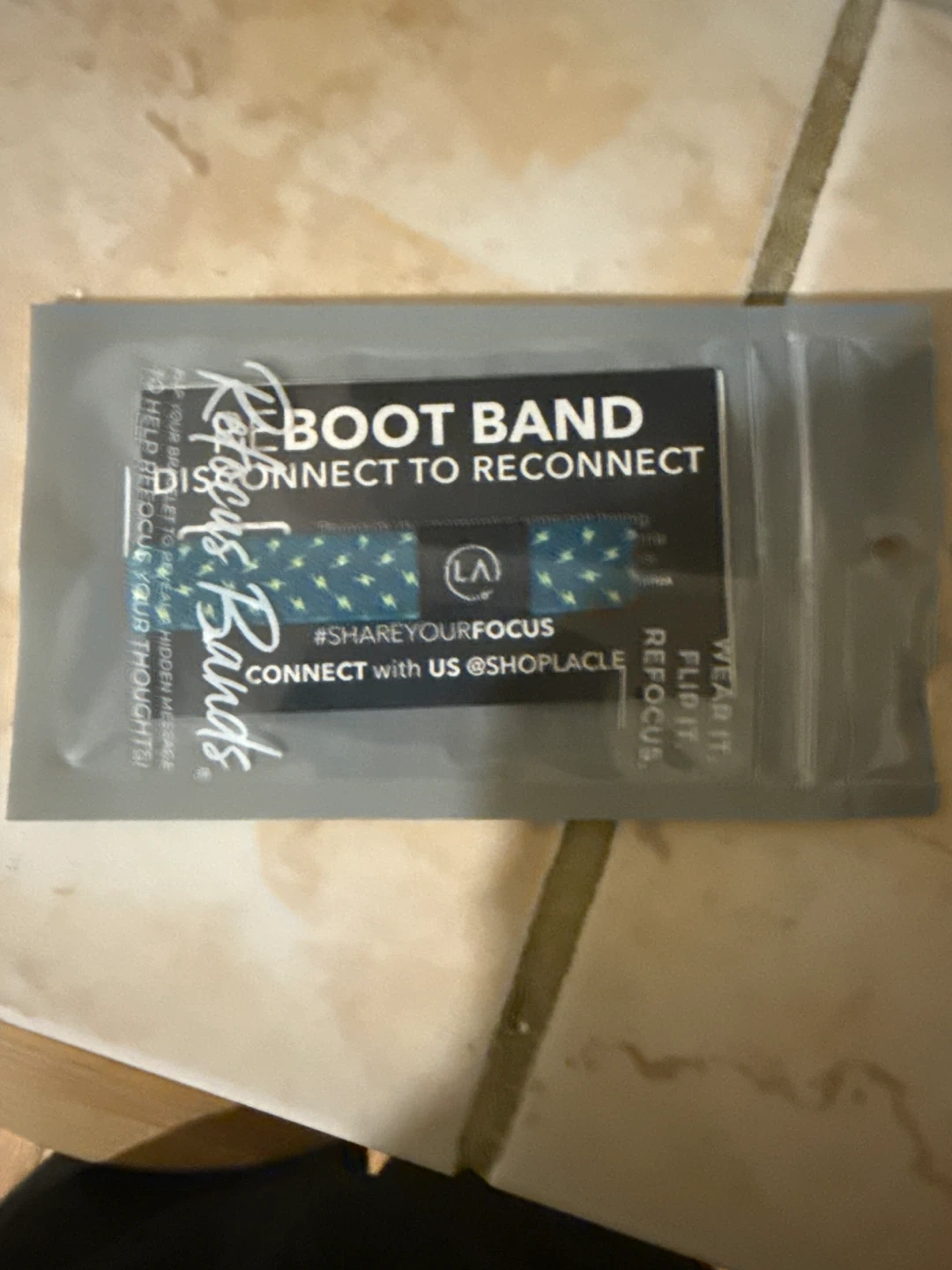This is a Focus Bands Reboot Band designed to help you disconnect to reconnect. It features a pattern with small lightning bolts and the brand's logo. The band has a hidden message to reveal hidden thoughts. It's designed to help refocus your thoughts!