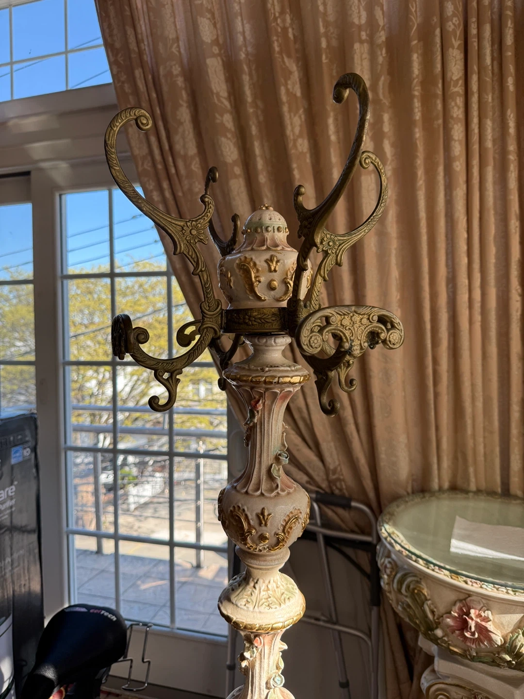 Beautiful vintage coat rack stand with an ornate design. It features multiple hooks for hanging coats, hats, and scarves. The stand has a decorative base and intricate detailing throughout.