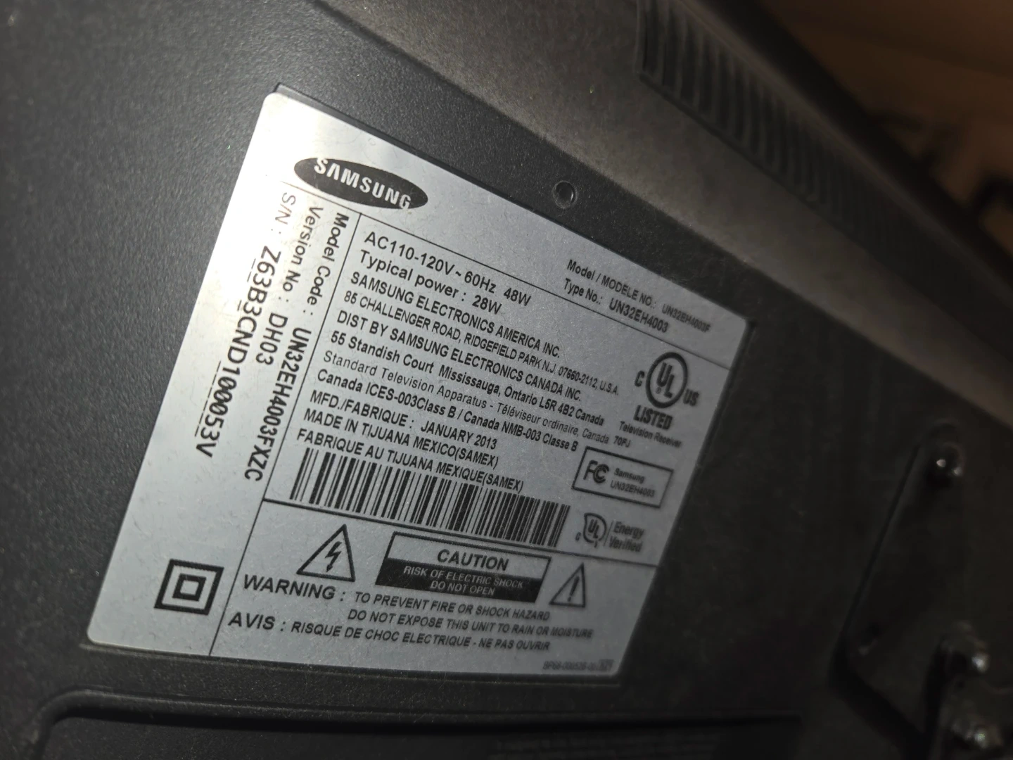 Samsung HD television. Typical power usage is 48W. Manufactured in January 2013 It's a great TV for a bedroom or secondary viewing area!
