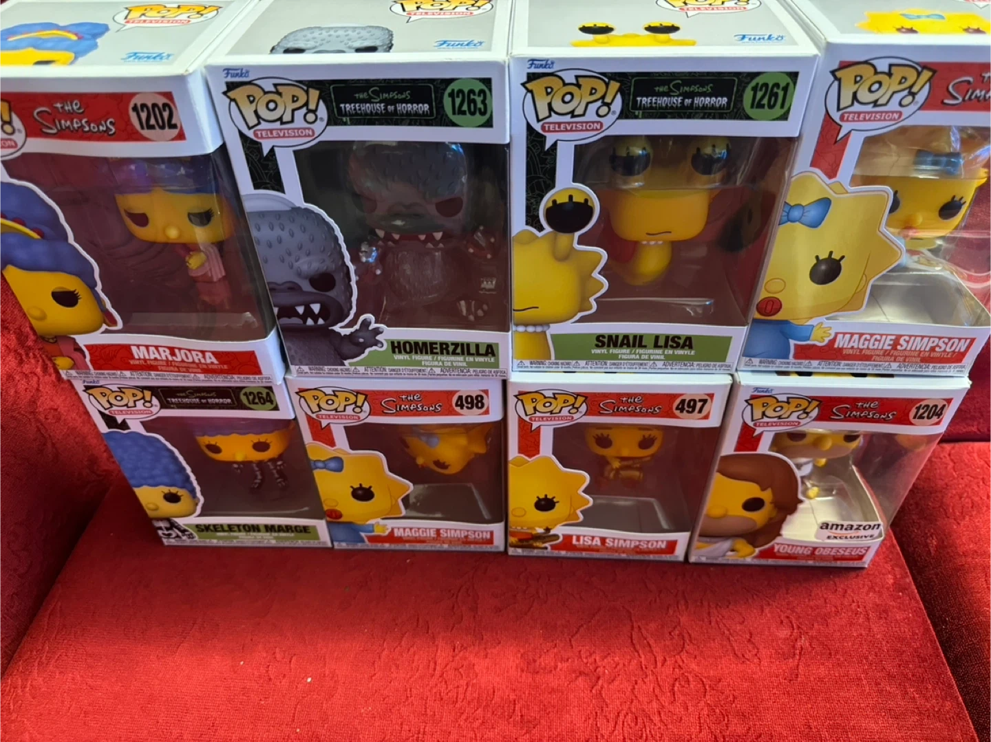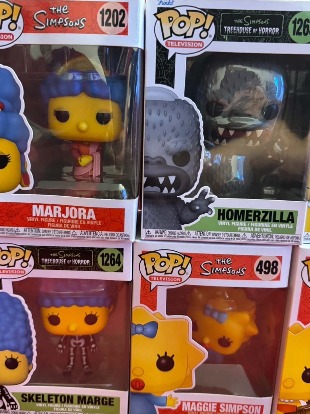 Collectible vinyl figures from The Simpsons television series. These Funko Pop! figures feature characters like Marjora, Homerzilla, Snail Lisa, Maggie Simpson, Skeleton Marge, Lisa Simpson, and Young Obeseus. Made of vinyl.