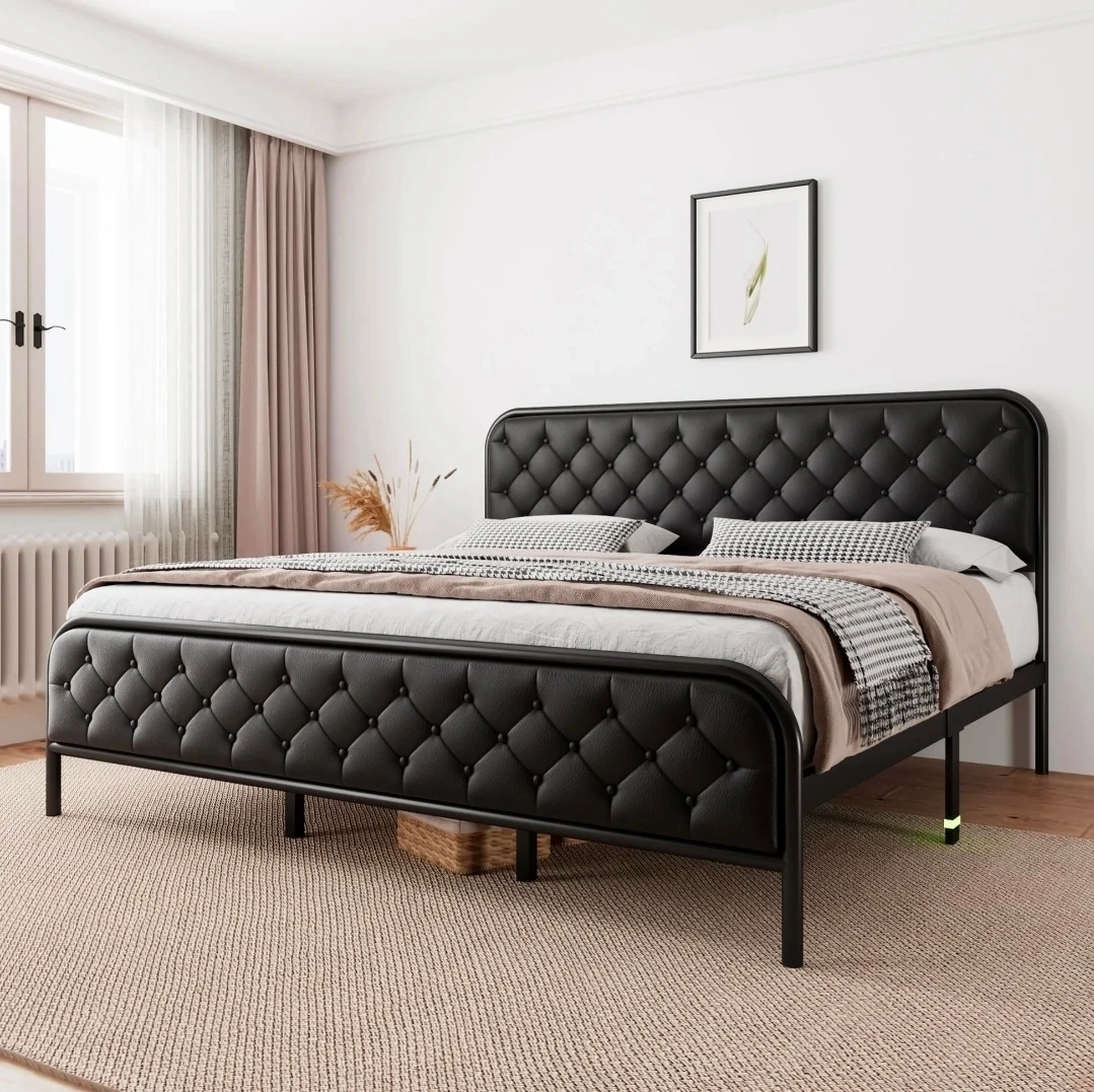 This frame combines industrial strength with a luxury aesthetic, featuring a beautiful Button Faux Leather Headboard and matching footboard. It’s in great shape and ready for a new home.