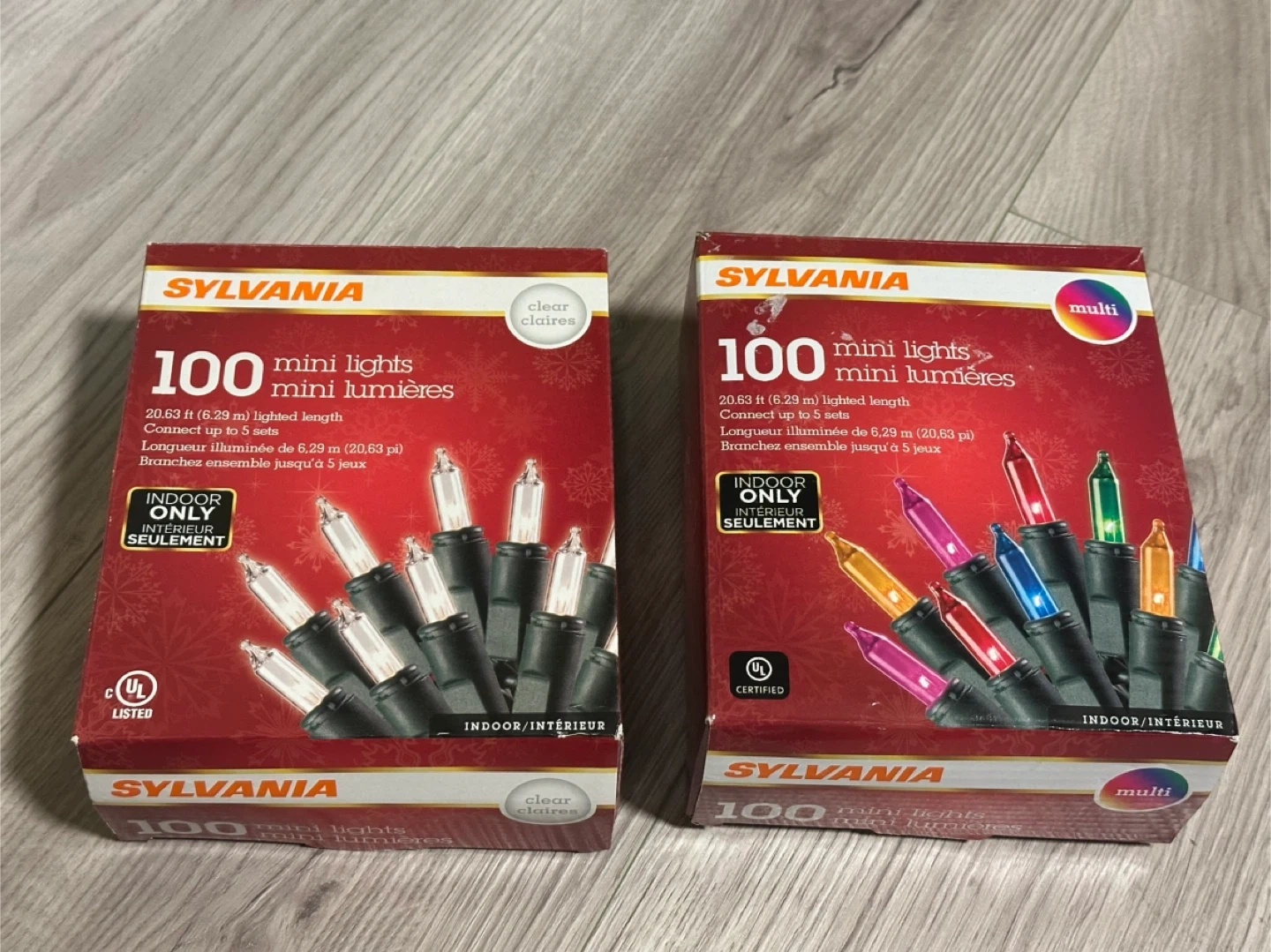 74Selling two Sylvania 100 Mini Lights! One box is a clear set, and the other is a multi-coloured set. Both come in their original boxes and are ready to brighten up your space for the holidays They are for INDOOR use only 6.29 m lighted length $7 for 1 box; $13 for 2 I only used them for last Christmas, it’s like-NEW condition