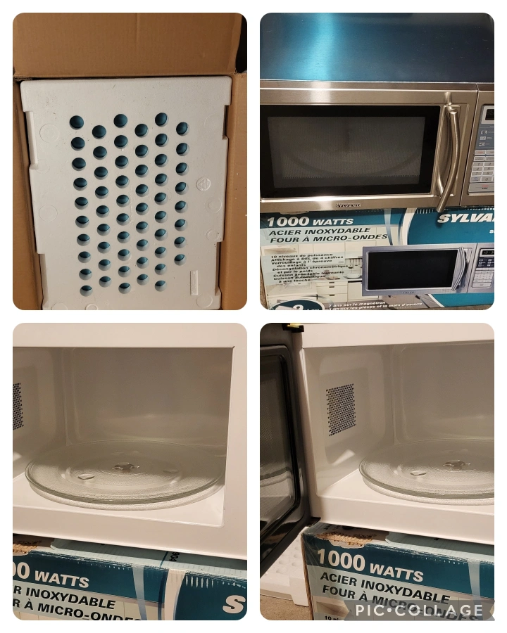 Selling a brand new Sylvania 1000 Watts stainless steel microwave! It's still in its original packaging, so it's ready to go to a new home. This microwave features a stainless steel finish and multiple power levels for all your cooking needs. Perfect for quick meals and reheating!