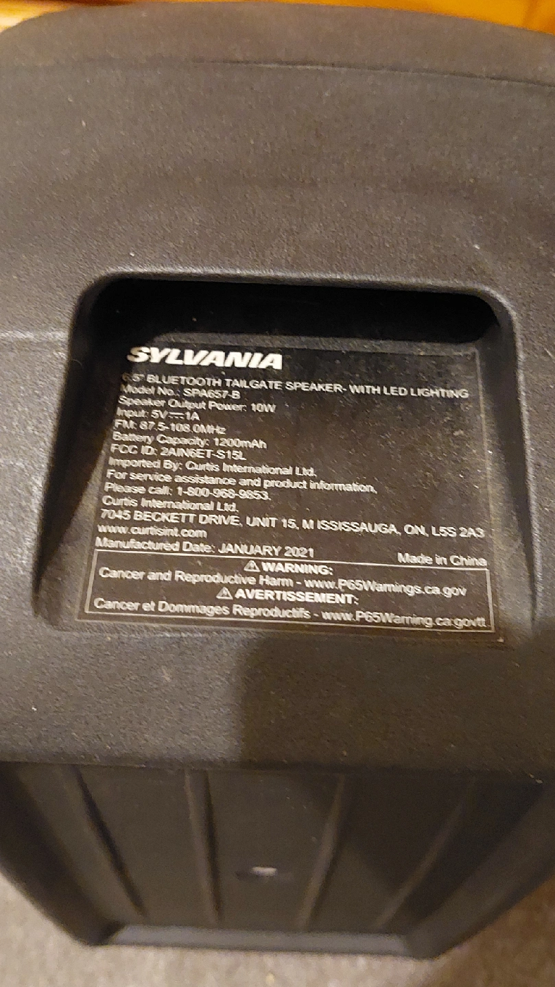 584Selling a Sylvania 6.5" Bluetooth Tailgate Speaker with LED lighting! It has a speaker output power of 10W and a battery capacity of 1200mAh. It also supports FM 87.5-108.0MHz. The manufacturing date is January 2021