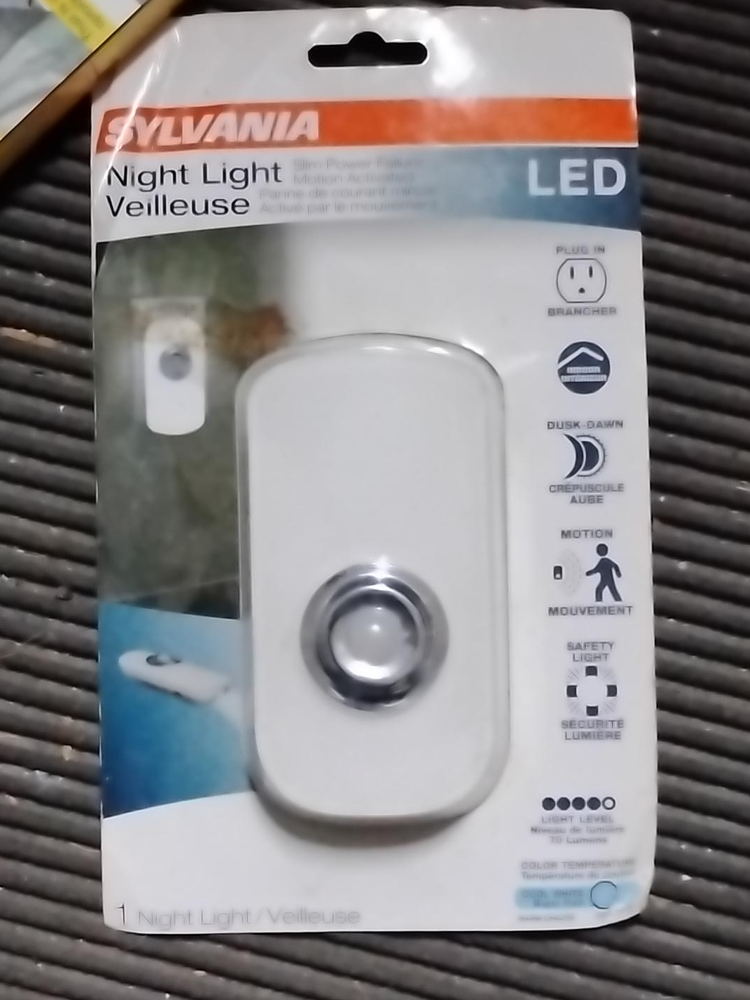 10Selling a brand new Sylvania LED night light, still in its original packaging! This night light features slim power failure motion activation and is activated by the movement. It also has a dusk-dawn sensor and a safety light feature. The light level is 70 Lumens and the color temperature is cool white
