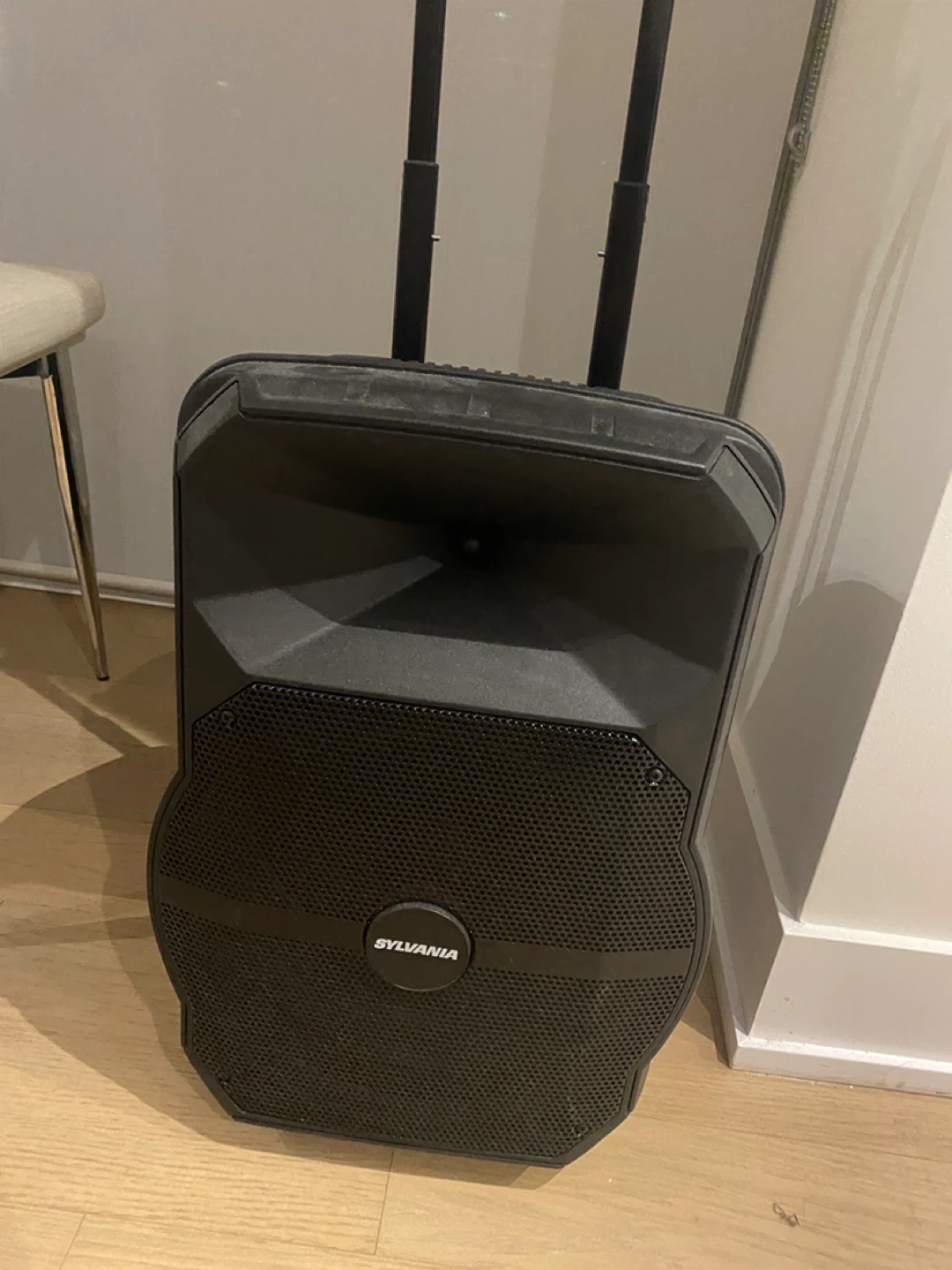Selling a portable speaker from Sylvania. It's black and has a retractable handle for easy transport. Great for parties or events!