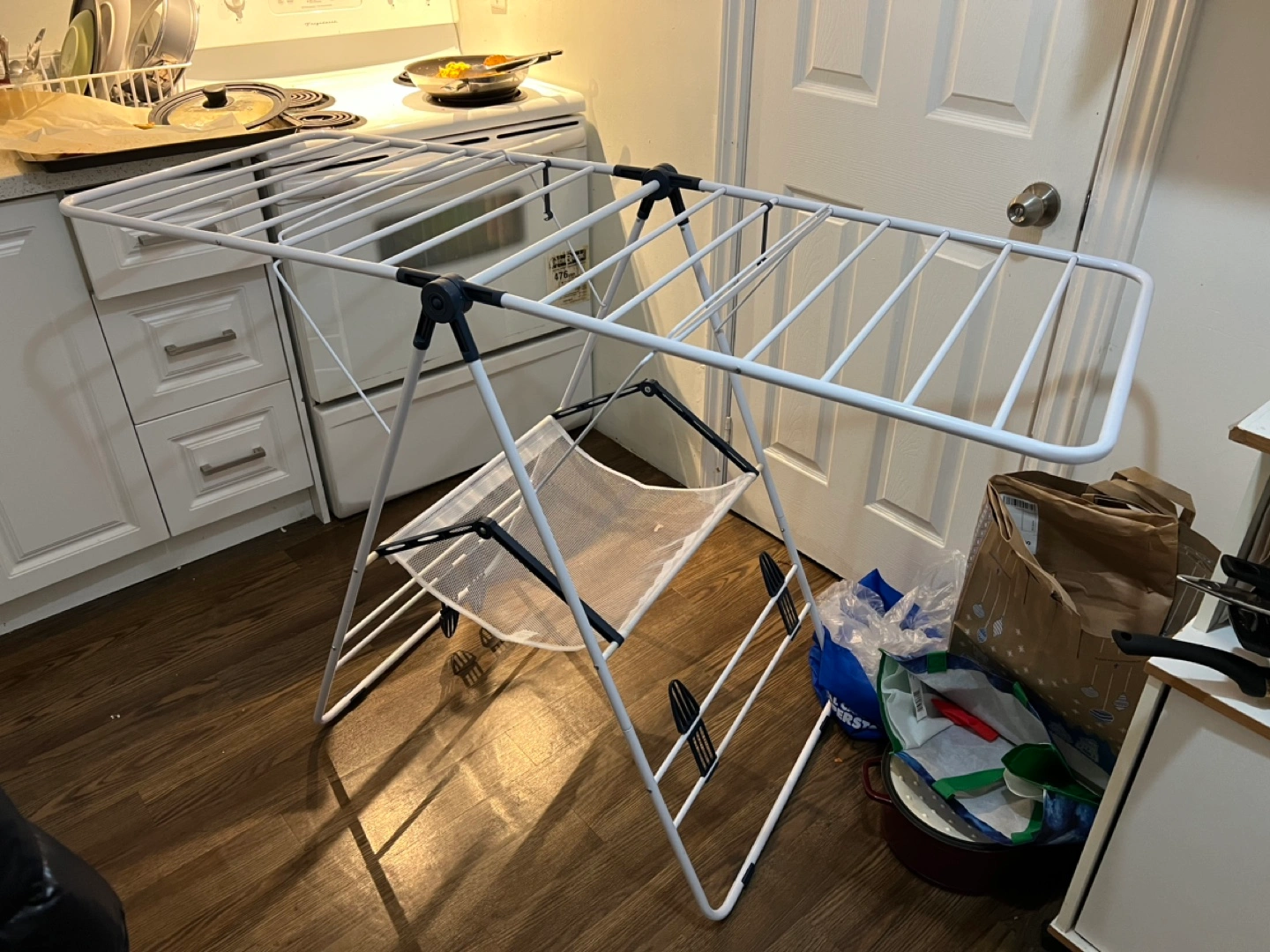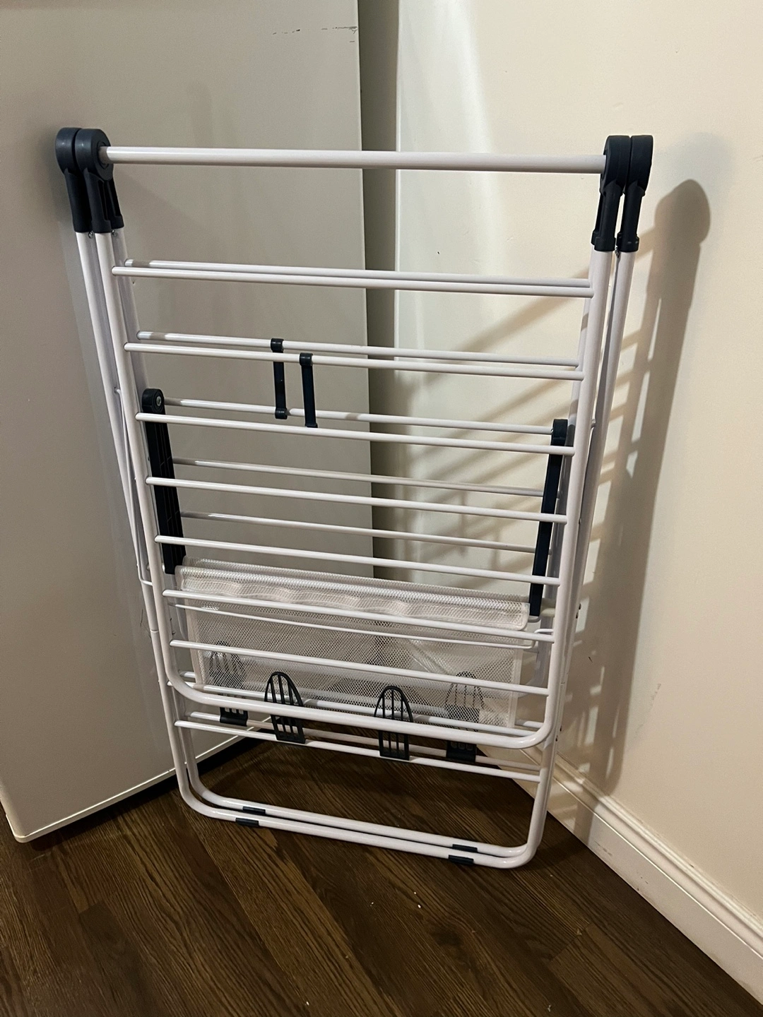 Portable clothes drying rack. Multiple bars for hanging clothes. Features a mesh laundry bag at the bottom. Folds flat for easy storage. Brand new
