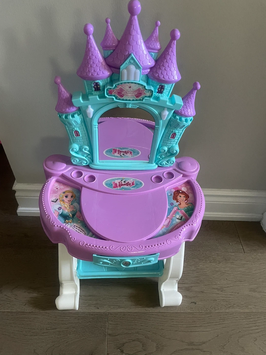Disney Princess castle vanity playset featuring characters like Cinderella and Rapunzel