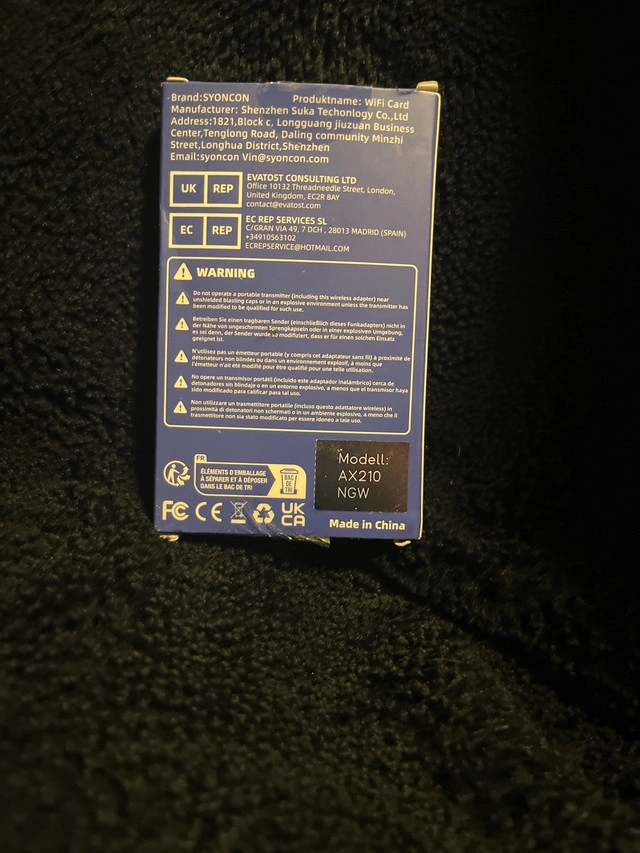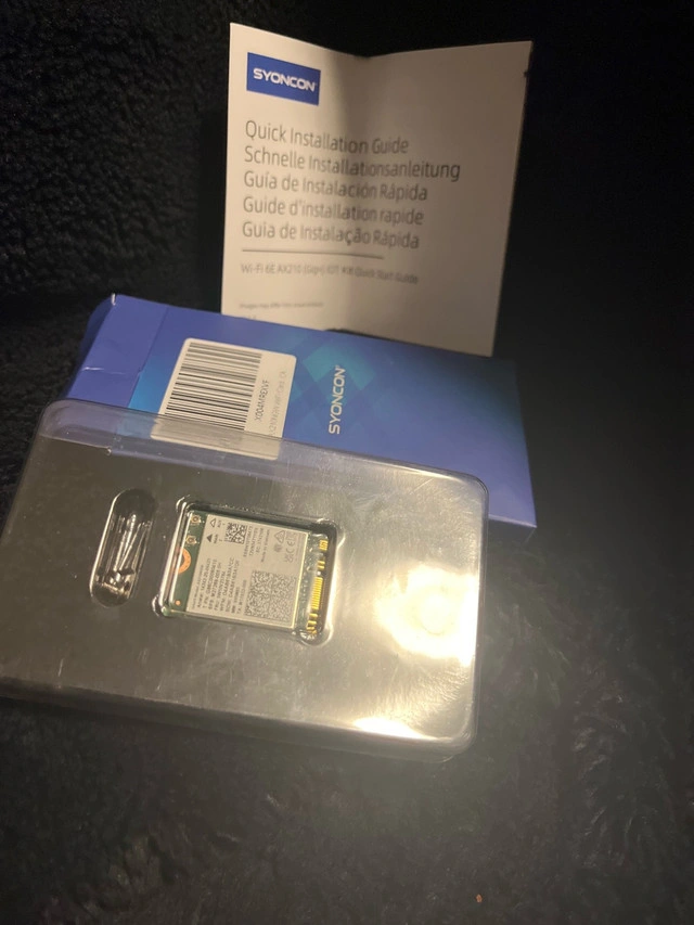 15Discover the SYONCON AX210 NGW WiFi card, new in its original box, perfect for improving your wireless connectivity. This card supports WiFi 6E standards, offering fast transfer speeds and low latency. Characteristics: * Brand: SYONCON * Model: AX210 NGW * Condition: New in sealed box * WiFi Standard: 6E * Interface: NGFF M.2 * Compatibility: Desktops and laptops