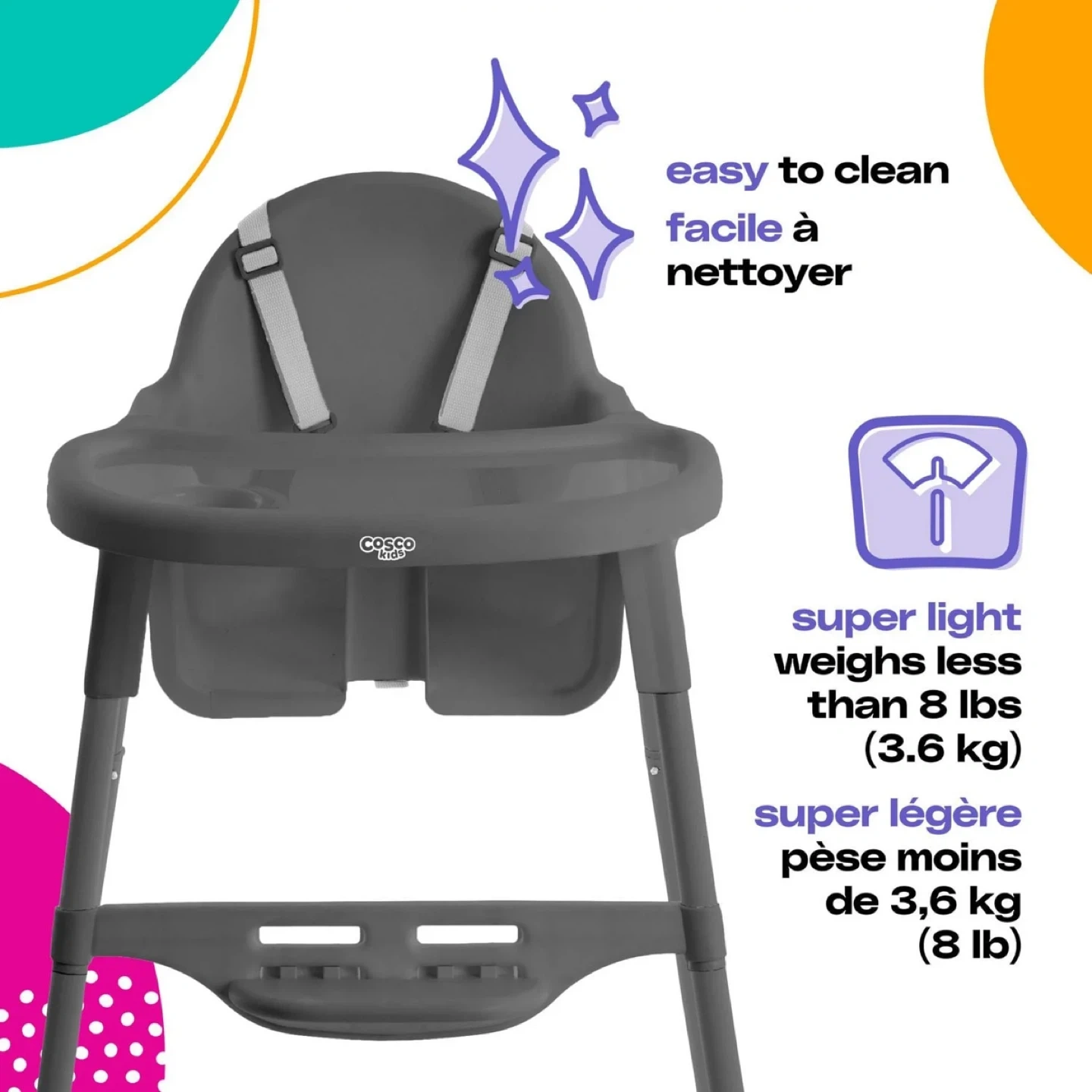 The Cosco Kids High Chair offers a fuss-free solution to feeding time. Lightweight and easy to clean. It is ideal for grandparents' homes, cottages, or wherever an extra high chair is needed. The removable tray rinses easily, and it can be attached to the back of the chair when not in use, allowing your child to join the family at the table. The Canteen High Chair is made from durable plastics, making cleanup a breeze! Simply wipe the chair with a damp cloth and it’s ready for the next meal.