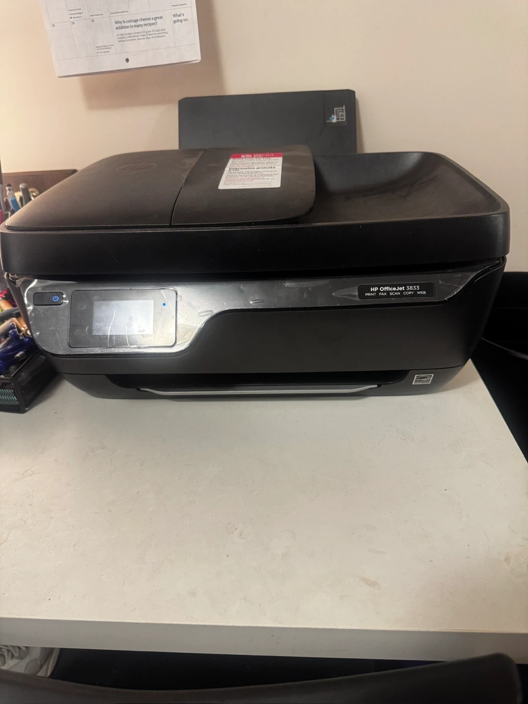 HP OfficeJet 3833 all-in-one printer. It's black and features print, fax, scan, and copy functions. Great condition barely used. Yes it works!! Just barely used. No need for it.