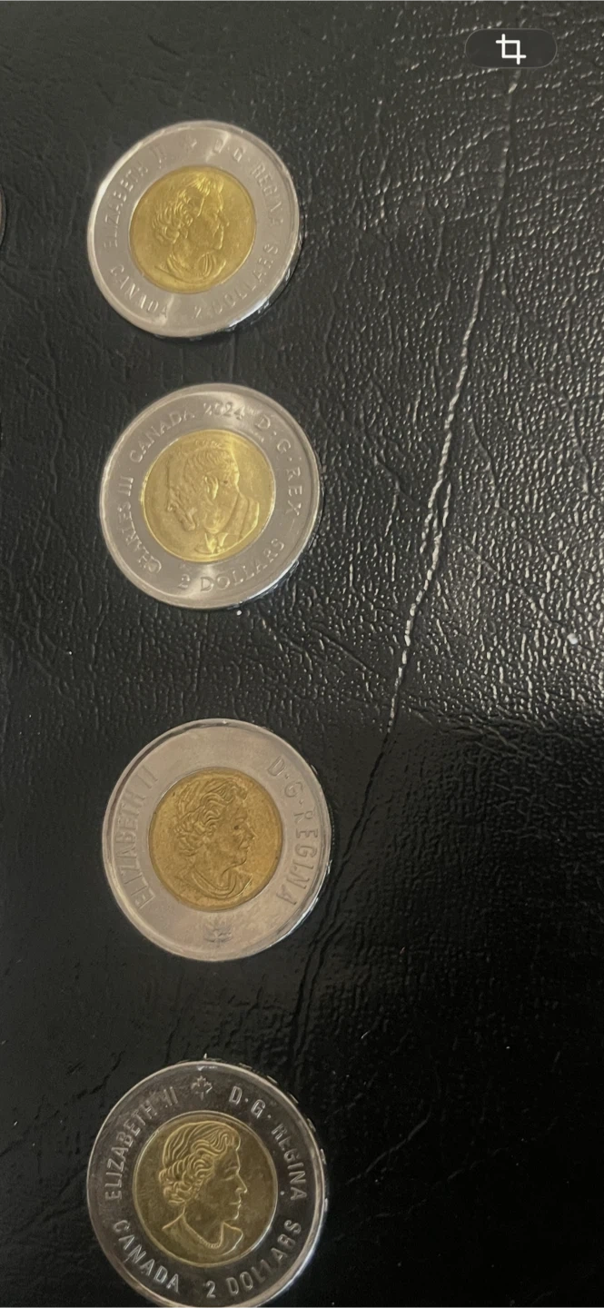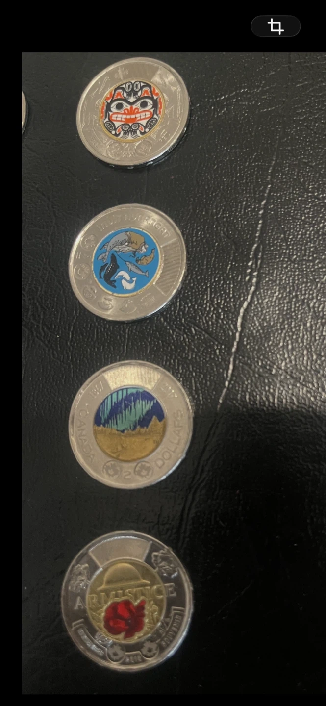 Collection of Canadian $2 coins (toonies) featuring different designs. Includes coins from 2017 and 2018 with various commemorative themes. These coins are great for collectors or anyone interested in Canadian currency.