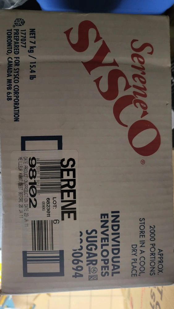 Selling a 7 kg box of Sysco Serene individual sugar envelopes - Approx 2000 portions - Prepared for Sysco Corporation, Toronto - Net weight: 7 kg / 15.4 lb - Best before 2011 January 26
