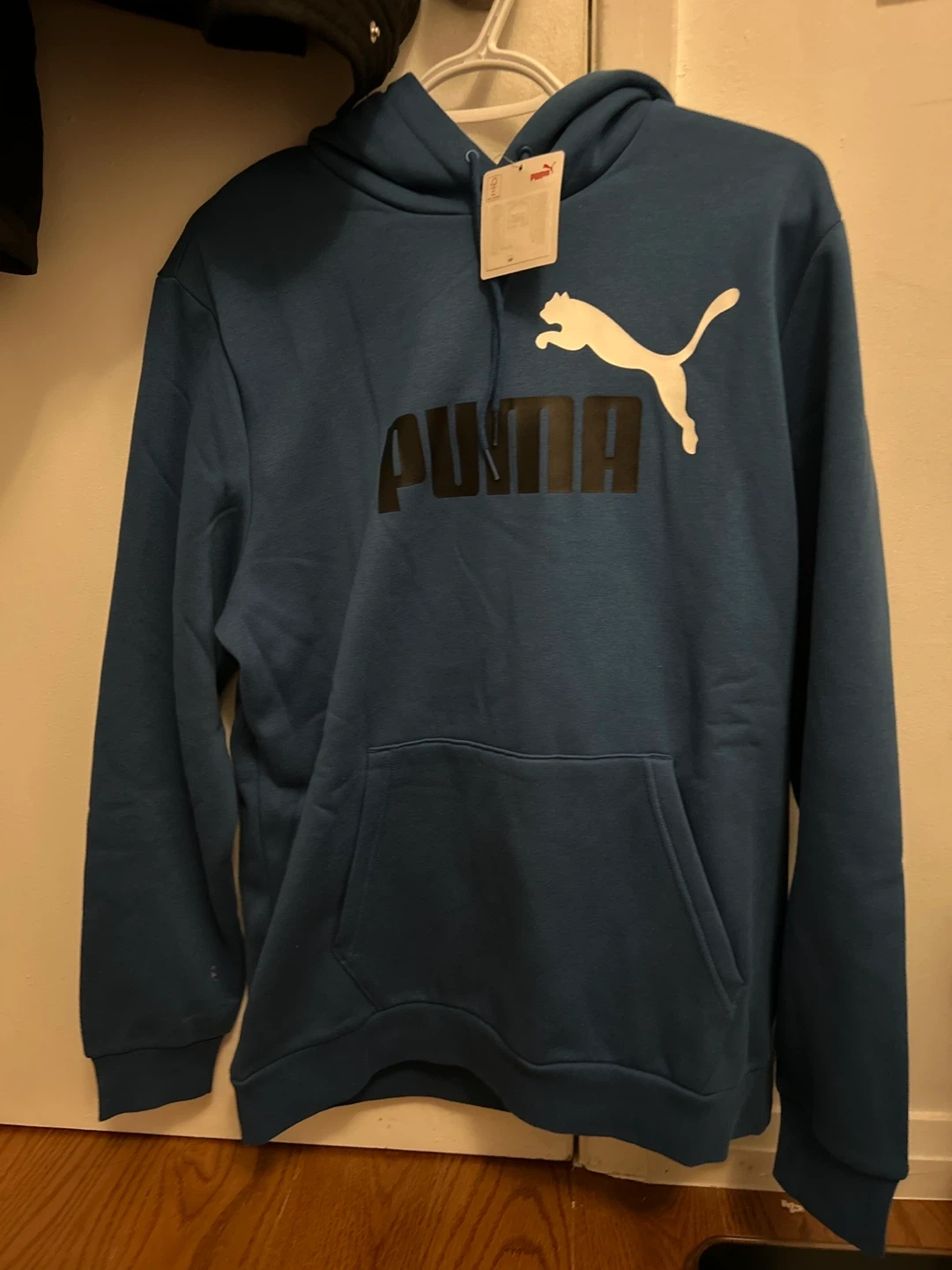 This is a blue Puma hoodie with a front pocket and a drawstring hood. It features the classic Puma logo on the chest. This hoodie is great for casual wear.