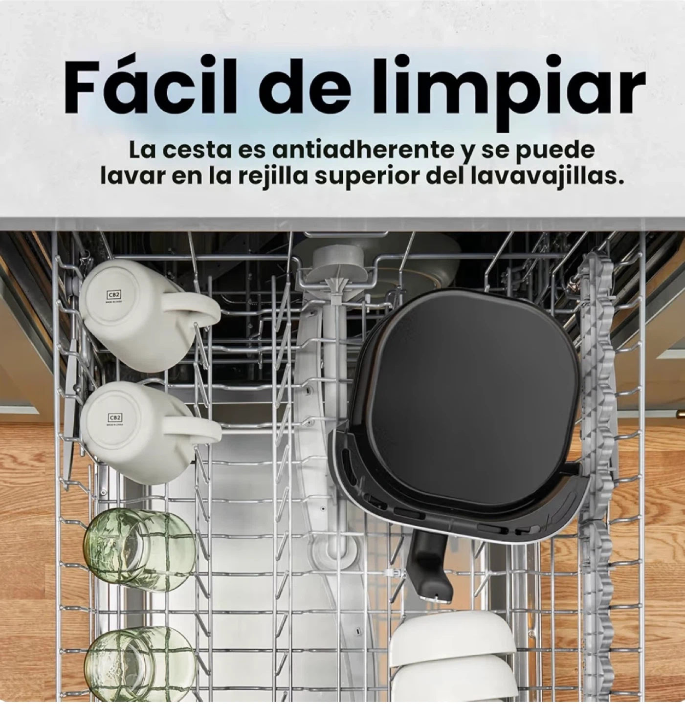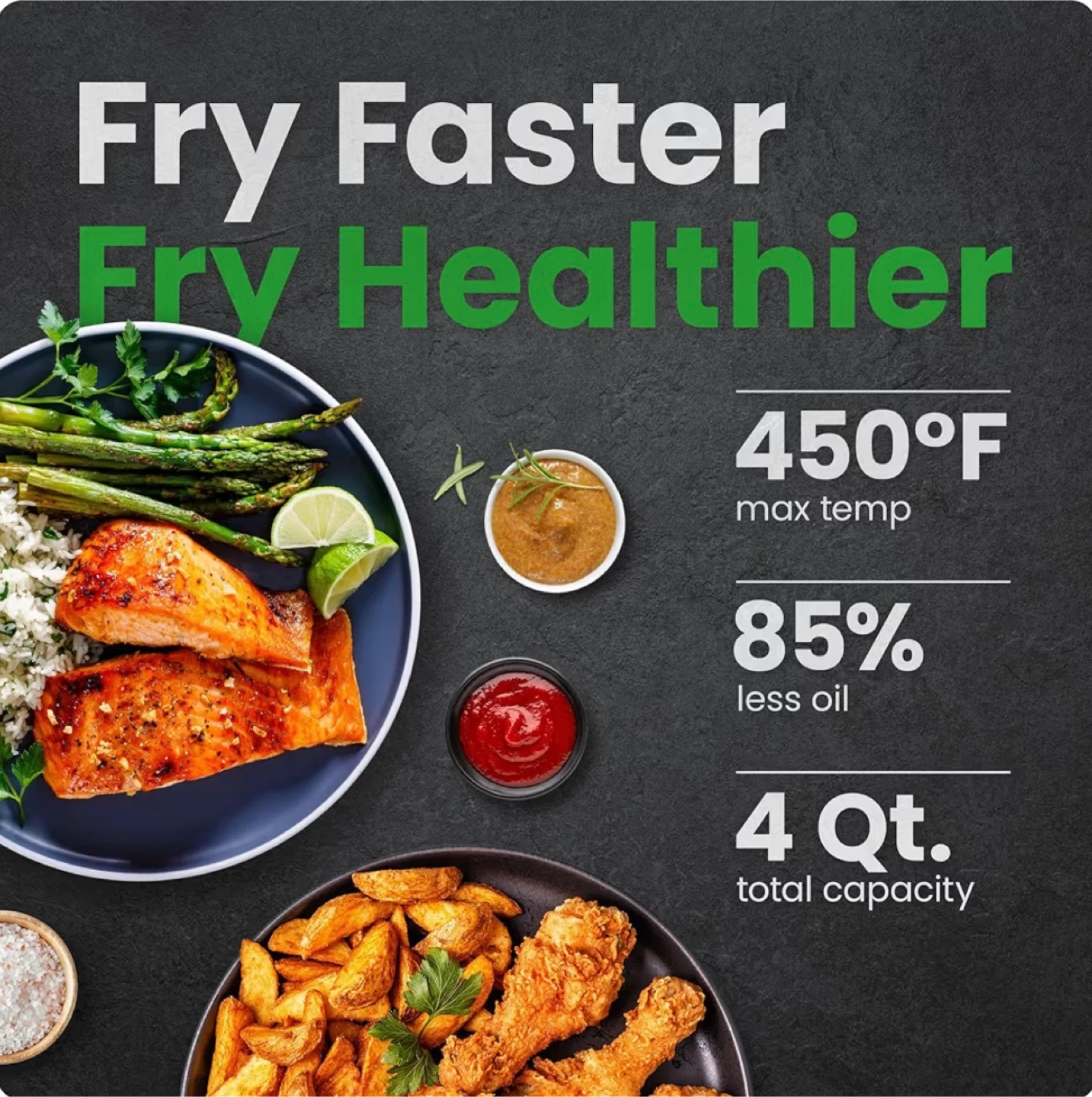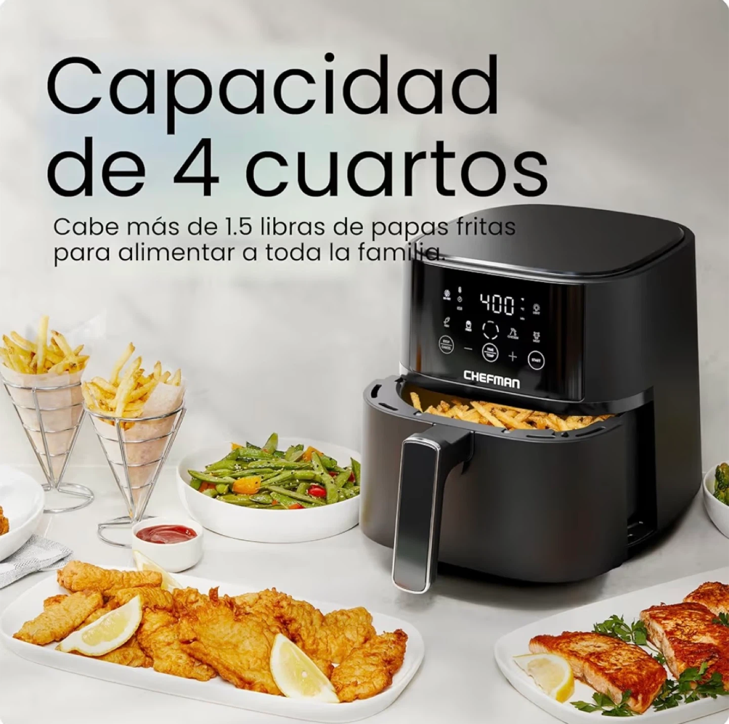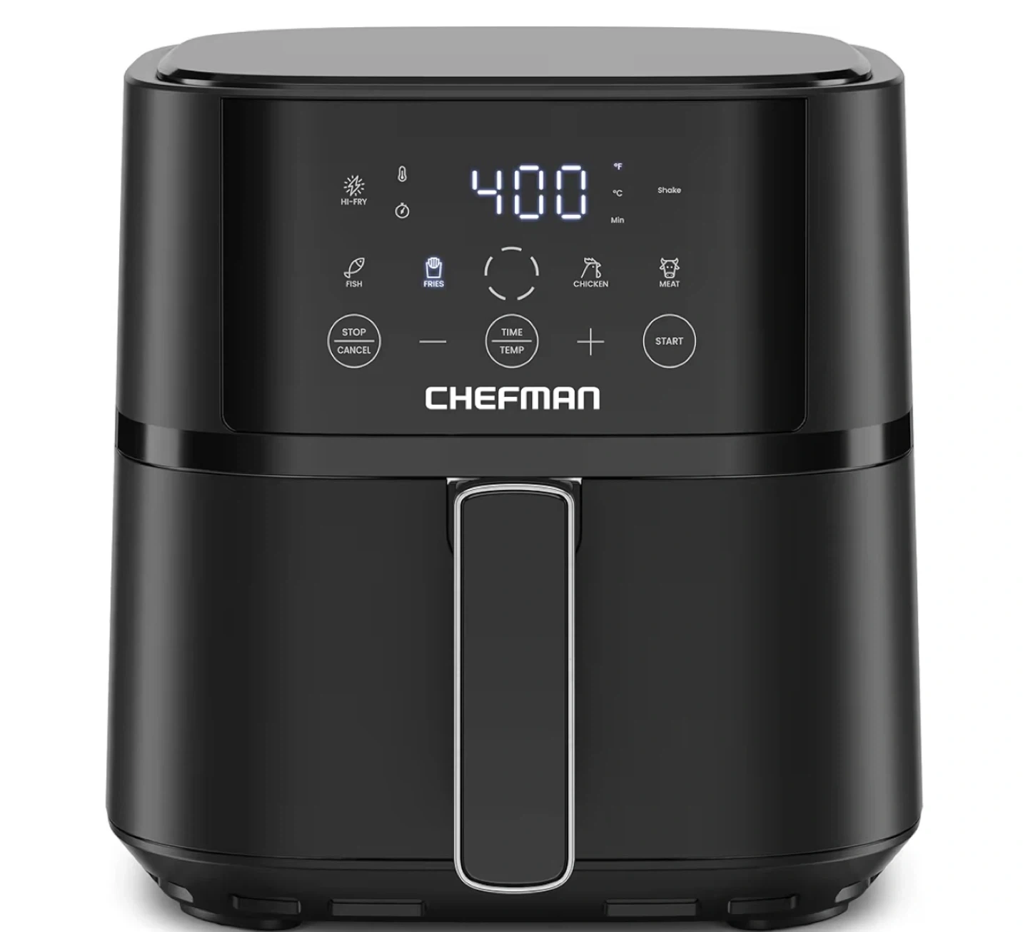 This Chefman air fryer has a 4 Qt. total capacity and a max temperature of 450°F. It uses 85% less oil for healthier cooking. Its digital display includes presets for fish, fries, chicken, and meat.