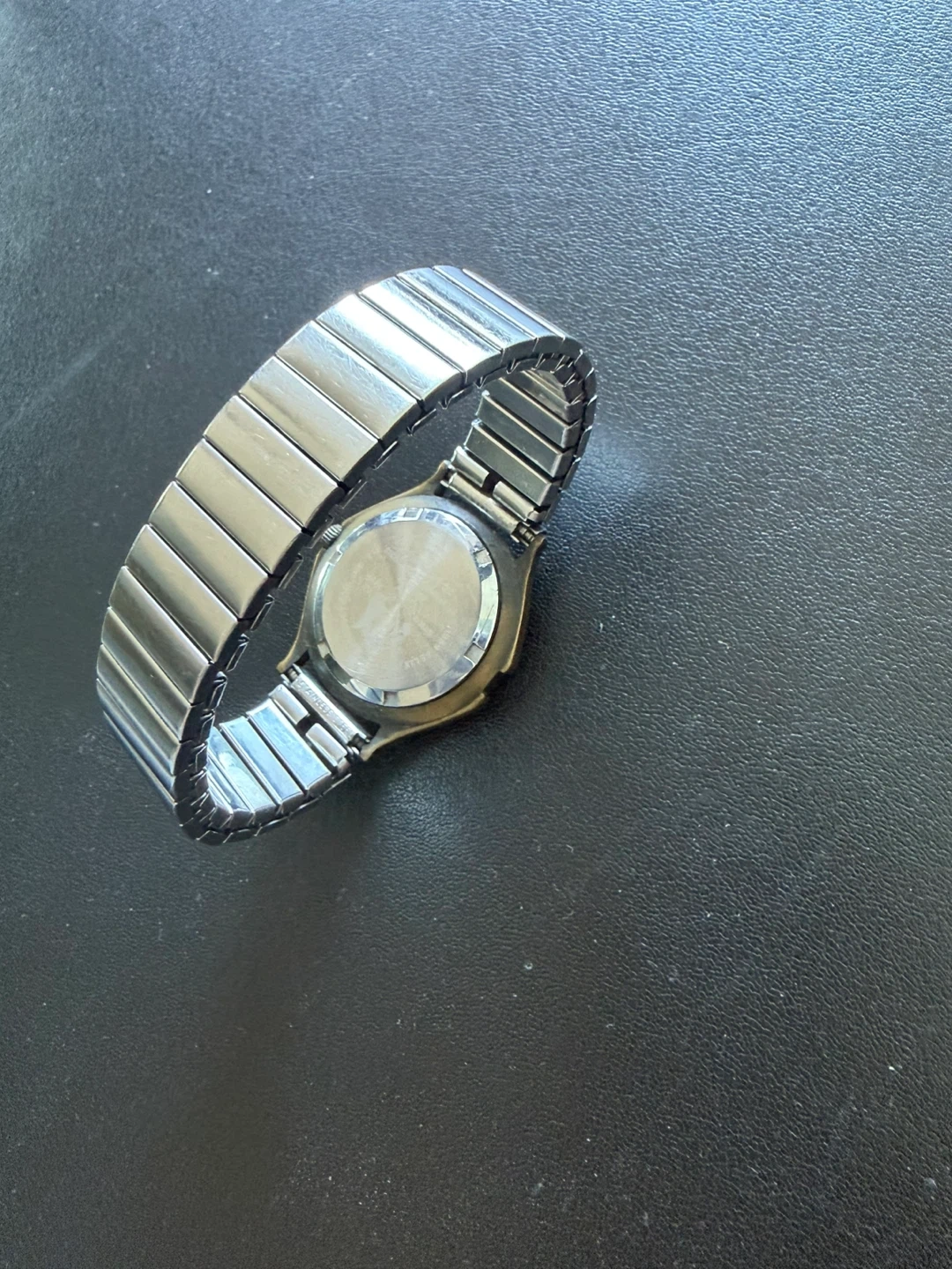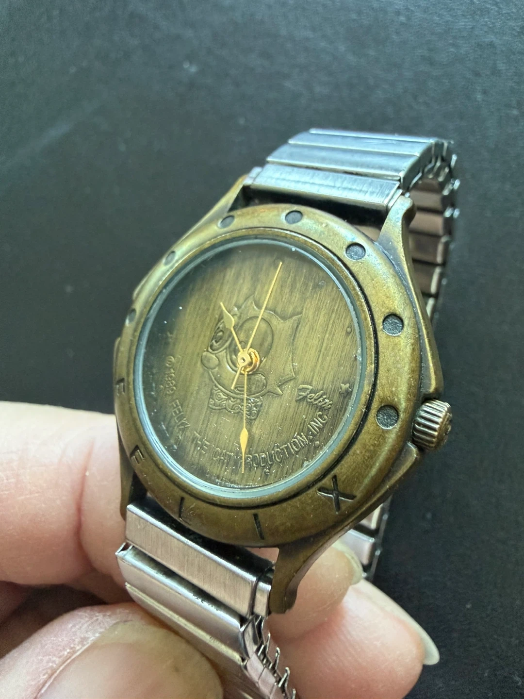 This is a Felix the Cat watch with a metal band. It features a vintage-style face. It's a cool accessory for any fan!