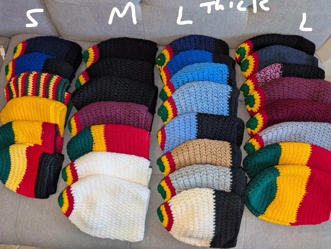 A collection of crocheted beanies featuring Rasta colours and solid black, blue, maroon, and white. Various sizes are available, including S, M, and L, with some styles noted as 'thick'. These hats are hand-knitted, perfect for keeping warm.