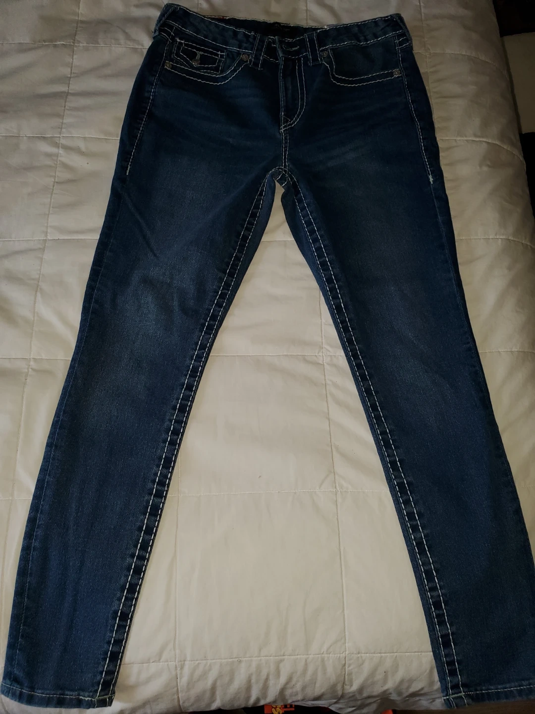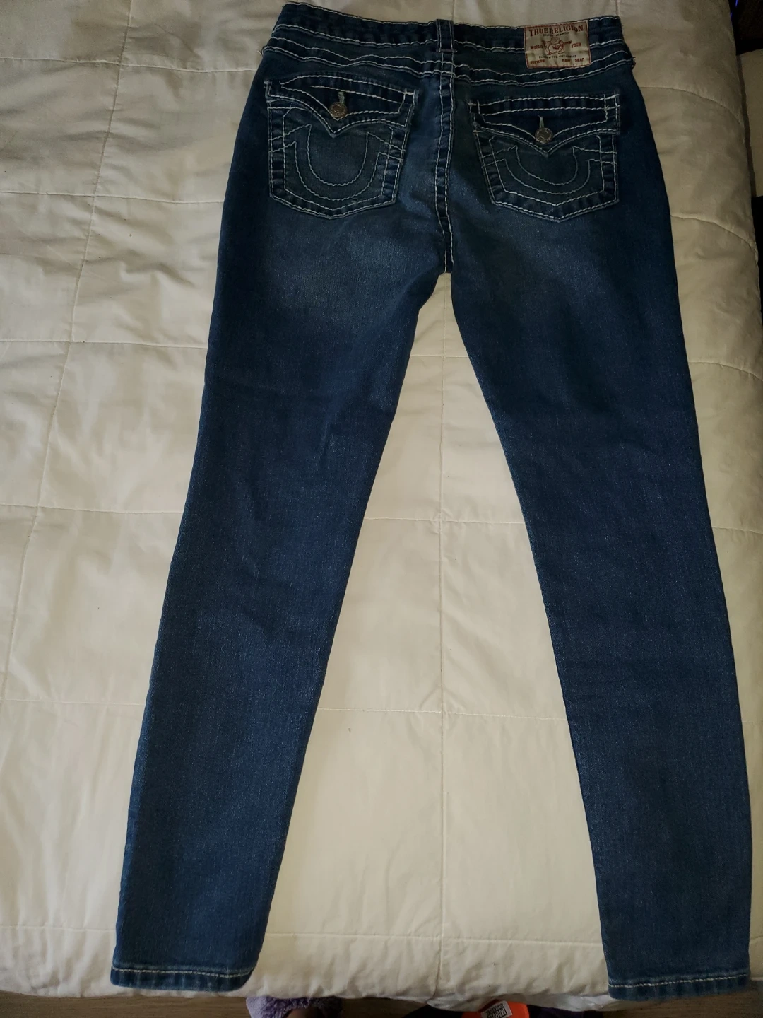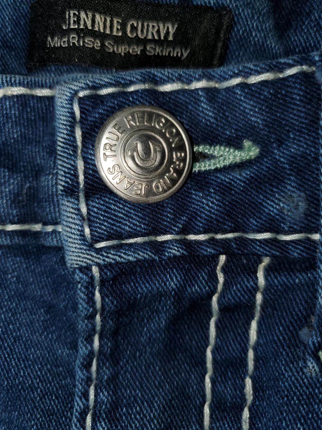 These are True Religion Jennie Curvy jeans. They're a mid-rise, super skinny fit. Size 31. Made in Bangladesh. Willing to negotiate asking price