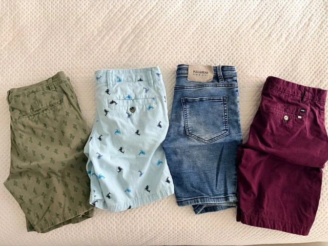 Voici un lot de quatre shorts pour homme de taille Small (28-30), parfaits pour la saison estivale. Ces shorts, bien qu'usagés, sont en bon état et prêts à être portés. Ils offrent un mélange de styles décontractés, incluant des motifs variés et des couleurs allant du vert cactus au bleu dauphin, en passant par un jean denim et un bordeaux élégant. Idéal pour ceux qui cherchent à diversifier leur garde-robe estivale avec des options confortables et stylées.