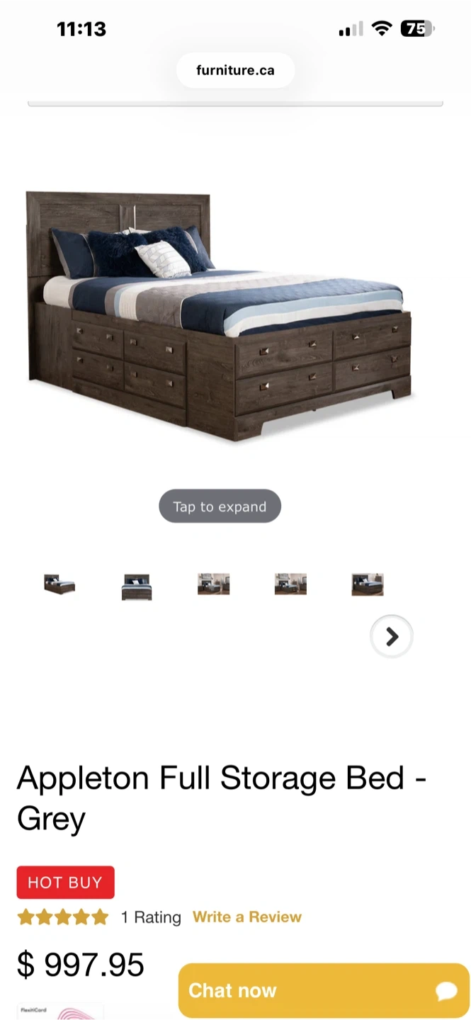 This Appleton full storage bed comes in a grey finish. It has multiple drawers built into the base for extra storage. The bed frame is made of wood. Purchased 2 years ago but we are moving and cant take this with us